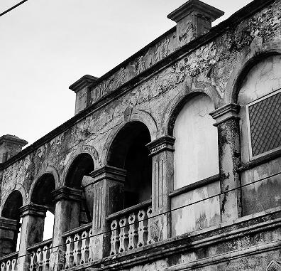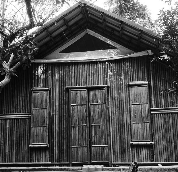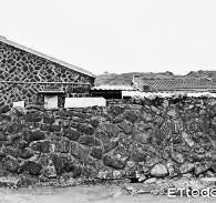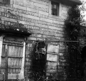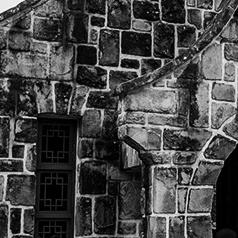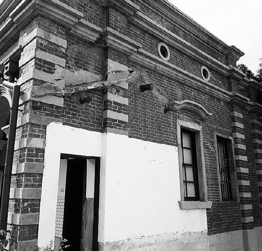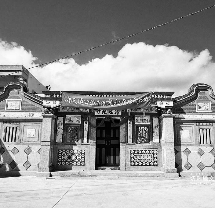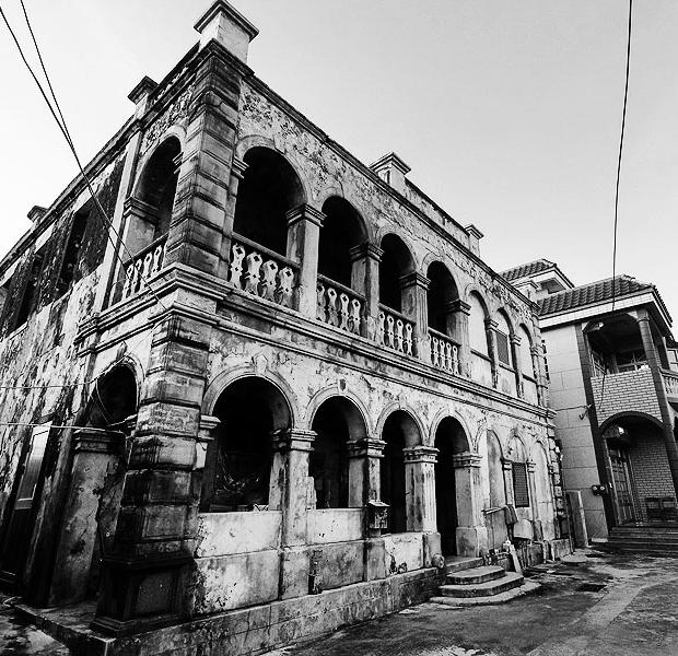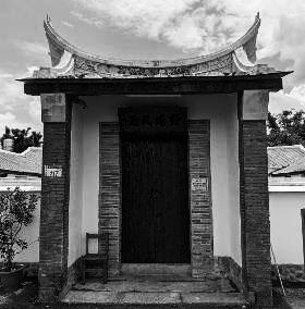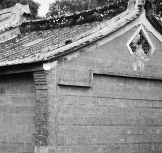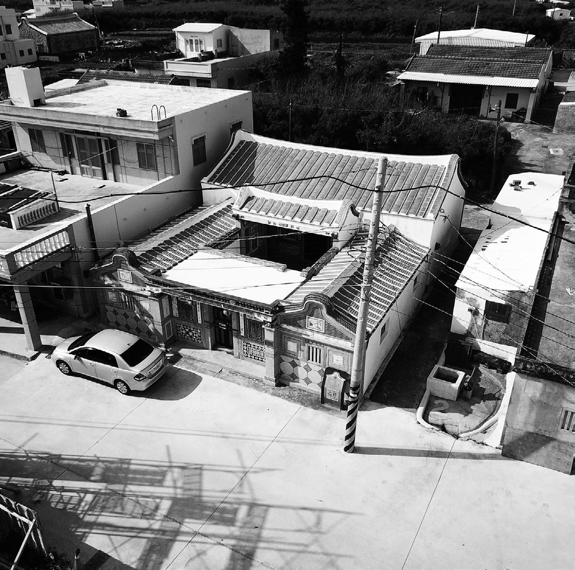 牆壁上深色磚塊拼設有 「卍」與「囍」字,階梯、 窗戶屬整片石材構成。屋頂 則為燕尾脊。 此外宅第後 方設有樹木,具有抵禦自然 氣候侵擾的功能,並與埕前 圍牆與建築圍塑屬私領域之 戶外空間,與周遭聚落建築 群形成獨立的生活場域。