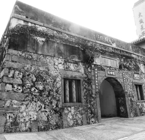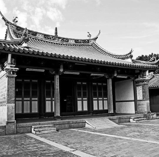 約6公分,柱珠下方亦使 用花崗石。地坪為尺二磚斜 鋪。左右學舍以清水磚豎砌 收頭。牆體為石上磚結構, 用硓咕石,在立面部份使用 亂石砌,再以薄磚收邊;主 要建築物則以淺刻方式呈現 六角形、八角形及圓形;磚 牆用斗砌磚結構,砌築的方 法有「三順一丁」及「一順 一丁」。前廳鳥踏線以上以 白灰粉刷,講堂牆面均粉刷 白灰,後廳則是鳥踏以上斗 砌磚牆外露;前廳正面的櫃 台腳以紅磚疊砌而成,而不 是以整塊石材雕砌。屋頂鋪 作僅前廳使用筒瓦,其它部 份均使用板瓦。屋脊以磚砌 築,脊堵以泥塑剪黏裝飾。