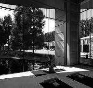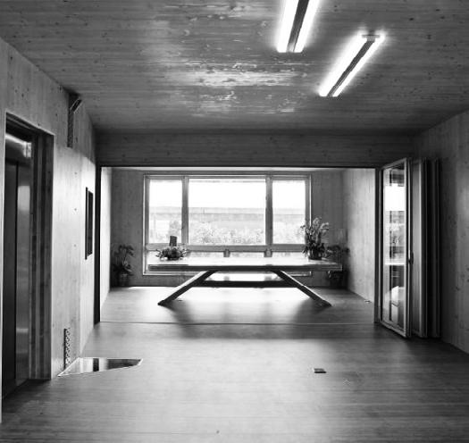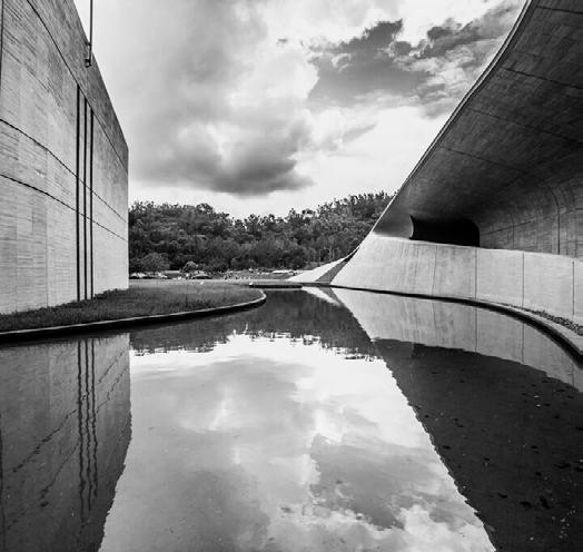 被森林圍繞。建築構成分為 專司環境管理的管理處以及 遊客中心。兩棟建築對照各 自基地周圍環境,皆隱藏著 各種具備個性的設計資質以 及可能性。例如自離地面數 公尺的高度向下俯瞰湖景, 與站在地面高度所欣賞到的 湖景,或許全然不同。再者, 藉著建築物前方水盤的設 置,利用湖水的反射作用, 不但拉近了與湖面的距離, 也增加了湖面幅員。而截取 局部風景的手法,則更加強 了其象徵性。這個規劃案的 設計重點,在於並非以建築 物來取代周遭環境景觀,而 是建構一個舞台裝置,讓人