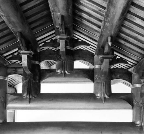 砌法及交錯砌法。磚塊以磚 的一邊平鋪在一起,磚塊的 砌面與牆面垂直,每一層的 磚塊與上下層交錯排列。內 隔牆使用紅磚或木材建造, 用於劃分不同的房間和功能 區域。屋頂結構:先搭建好 屋架結構,包括樑和椽子。