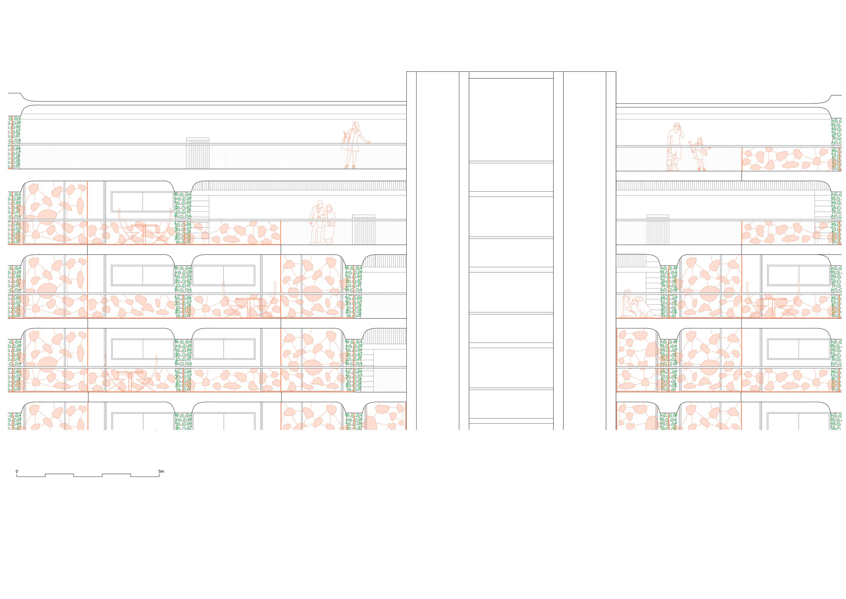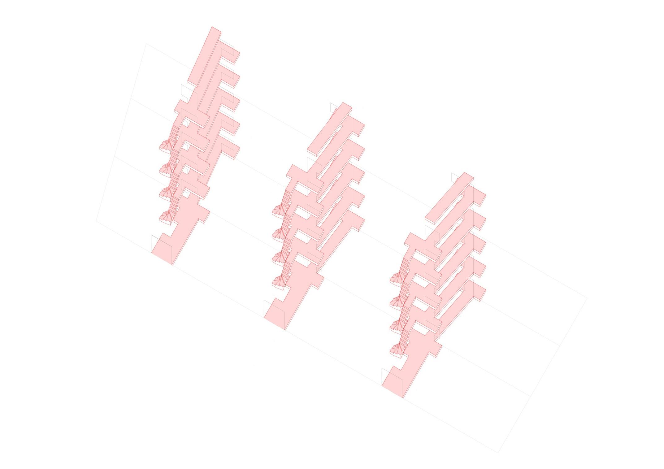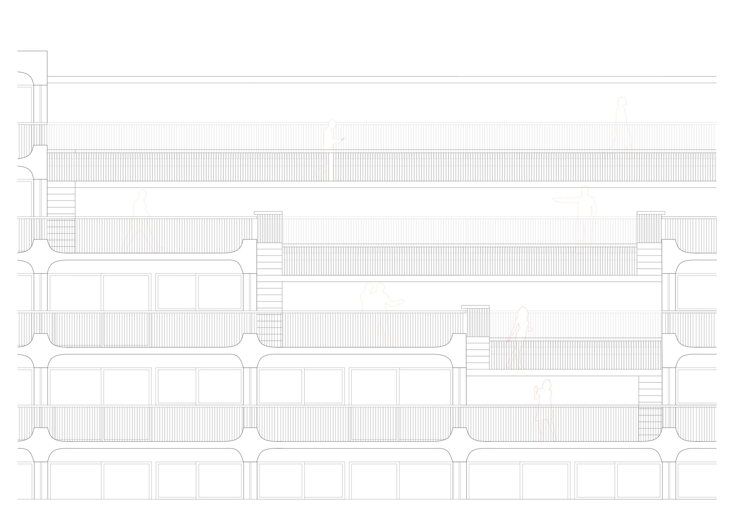 En cuanto al diseño de las pasarelas, se han ubicado estratégicamente una sobre otra para crear los aspectos estudiados durante la fase de análisis, tales como el confort, la intimidad y la conexión visual con el patio. Esto ha dado lugar a un juego de visuales y de los distintos grados de privacidad entre los diferentes patios y las pasarelas, mejorando la experiencia espacial y promoviendo la interacción entre los espacios.