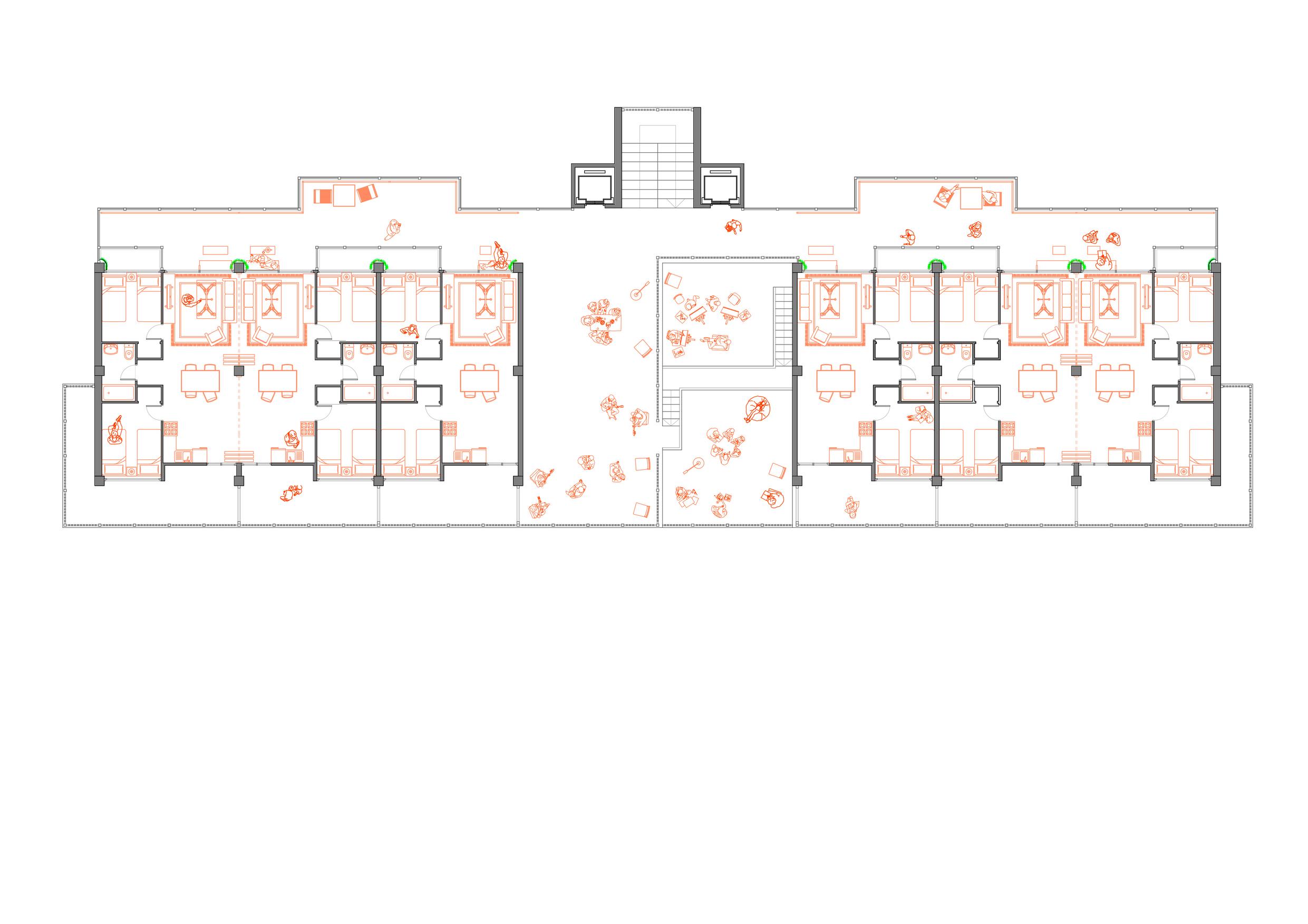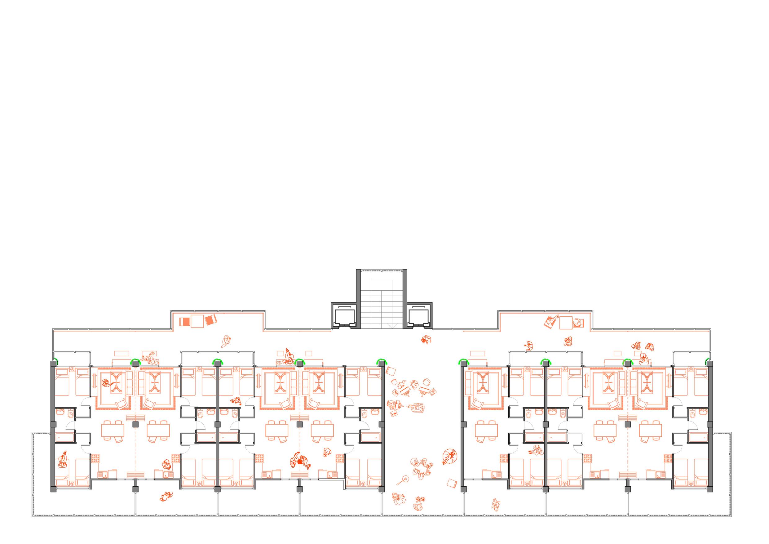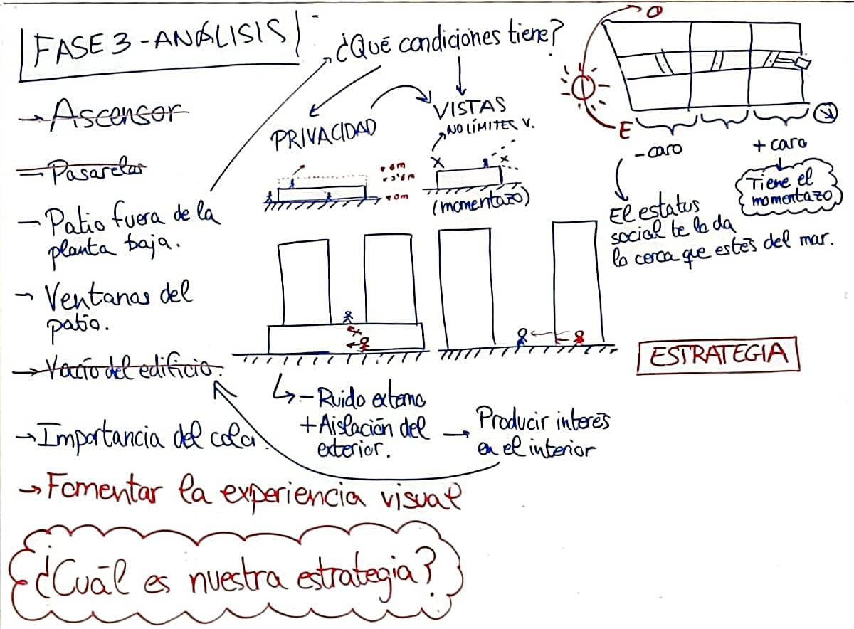 En el dibujo a tratar, se pueden observar detalladamente todos los aspectos mencionados anteriormente, así como las estrategias utilizadas por Pietri Architects. Se aprecia cómo se han implementado las pasarelas para conectar los bloques del edificio y fomentar la conexión visual con el patio. También se visualiza la ubicación estratégica de la caja de escaleras y el diseño de la puerta de la pasarela para dirigir la atención hacia el exterior. Además, se evidencia el concepto del vacío dentro del patio y el juego de visuales entre este y las pasarelas, así como el mirador hacia el mar que enmarca el paisaje. Todo esto muestra la cuidadosa planificación y ejecución del diseño arquitectónico por parte de Pietri Architects.