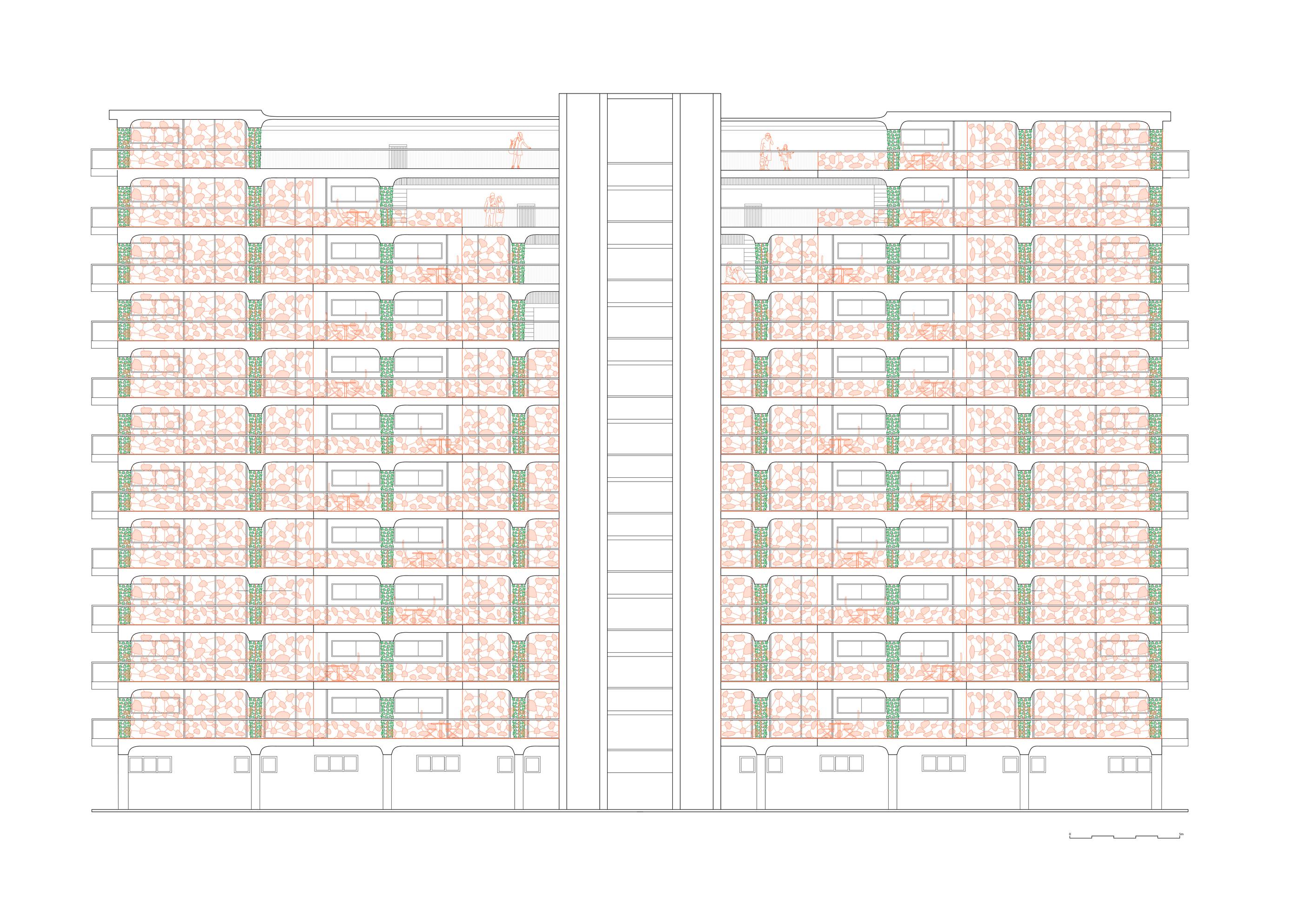 A efectos de fachada, esta se ha modificado a través de la extracción de las tres viviendas más altas y cercanas al hueco de escaleras: una situada en la planta 8 y otras dos en la planta 9. Posteriormente, estas plantas han sido reubicadas en una nueva planta: la planta 11, con dos viviendas en el extremo derecho y una vivienda en el extremo izquierdo del edificio. Este cambio ha contribuido a alterar la distribución y el aspecto exterior del edificio.