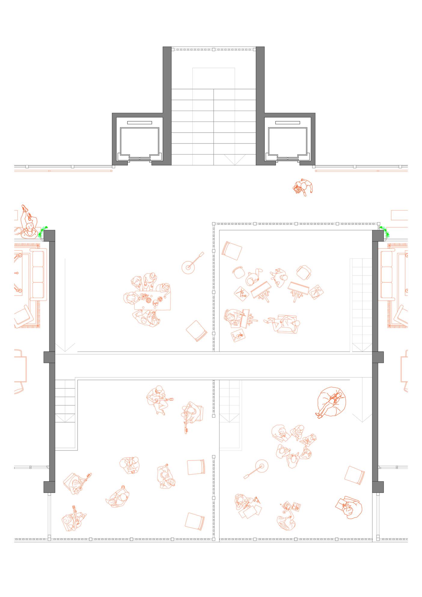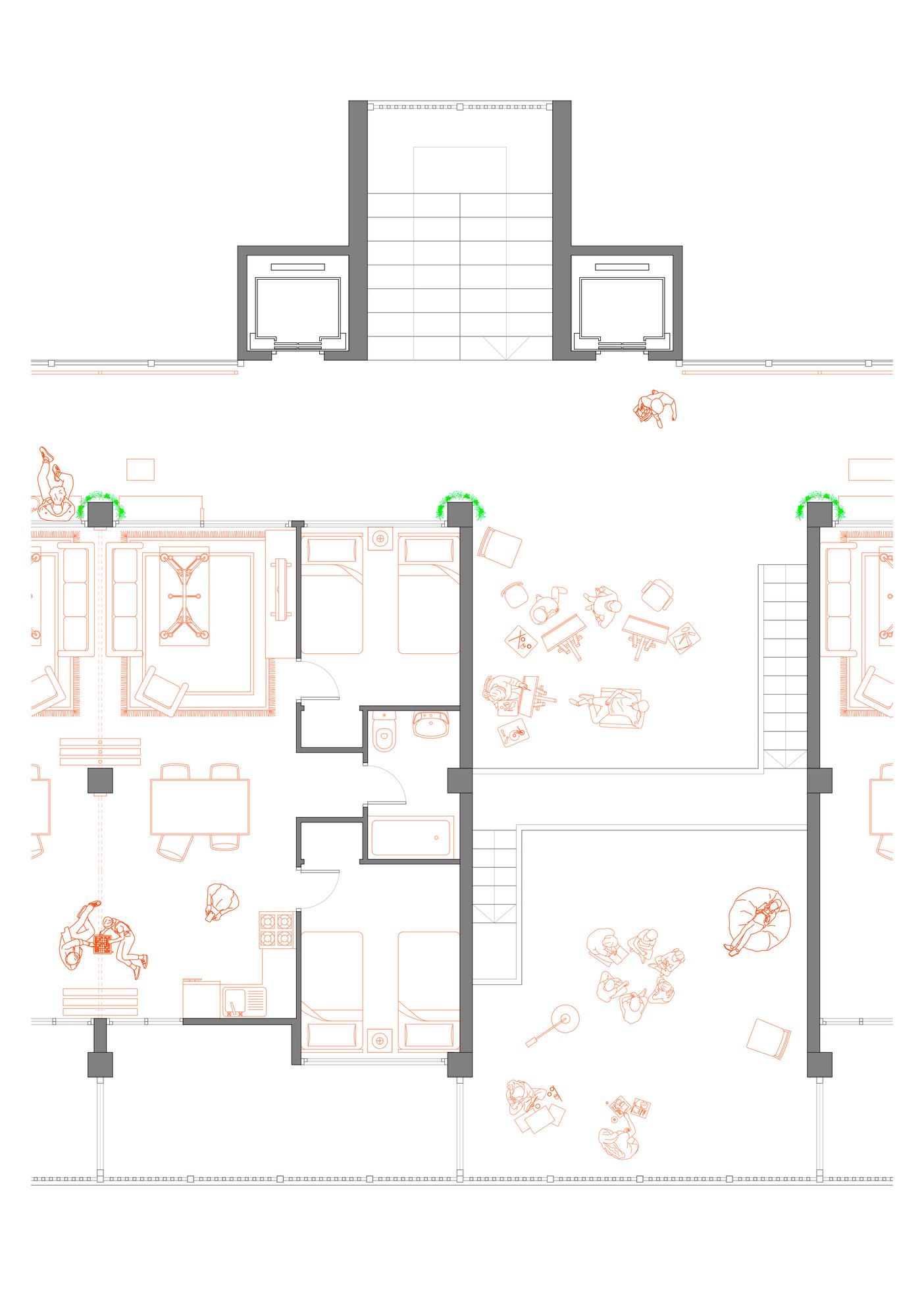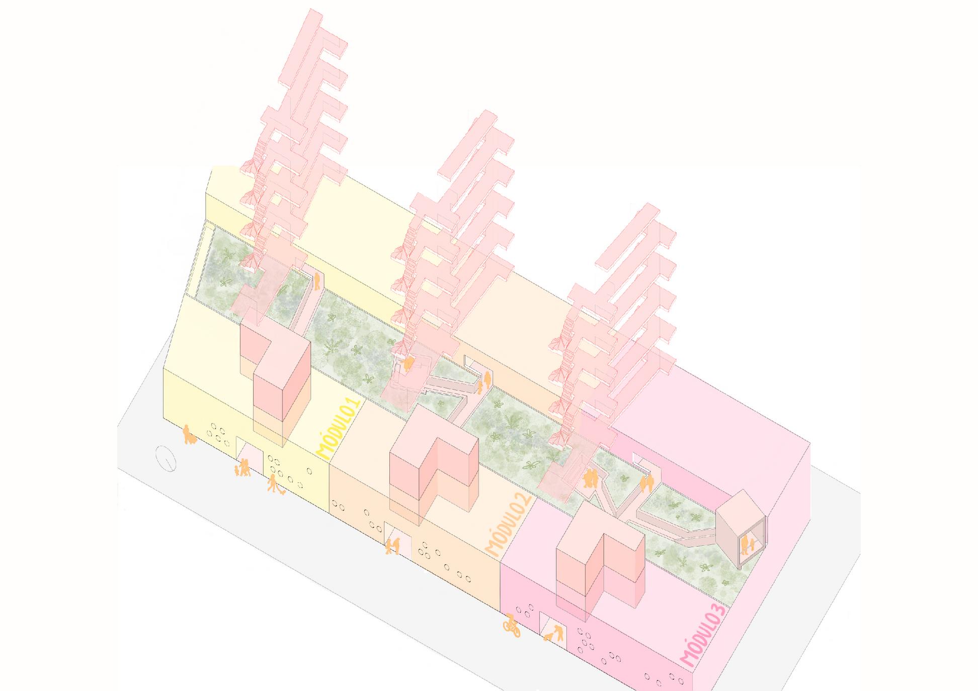Además, es notable la estratégica ubicación de la caja de escaleras, la cual se encuentra exclusivamente en el bloque norte de viviendas el cual se ubican las 3 respectivas entradas principales. Esta disposición crea una relación indirecta con el patio para aquellos residentes cuyas viviendas están ubicadas en dicho bloque, eliminando la necesidad de atravesar las pasarelas para llegar a sus hogares. Sin embargo, el bloque de viviendas opuesto establece una conexión directa con el patio, ofreciendo una experiencia más inmediata de interacción con el entorno exterior.