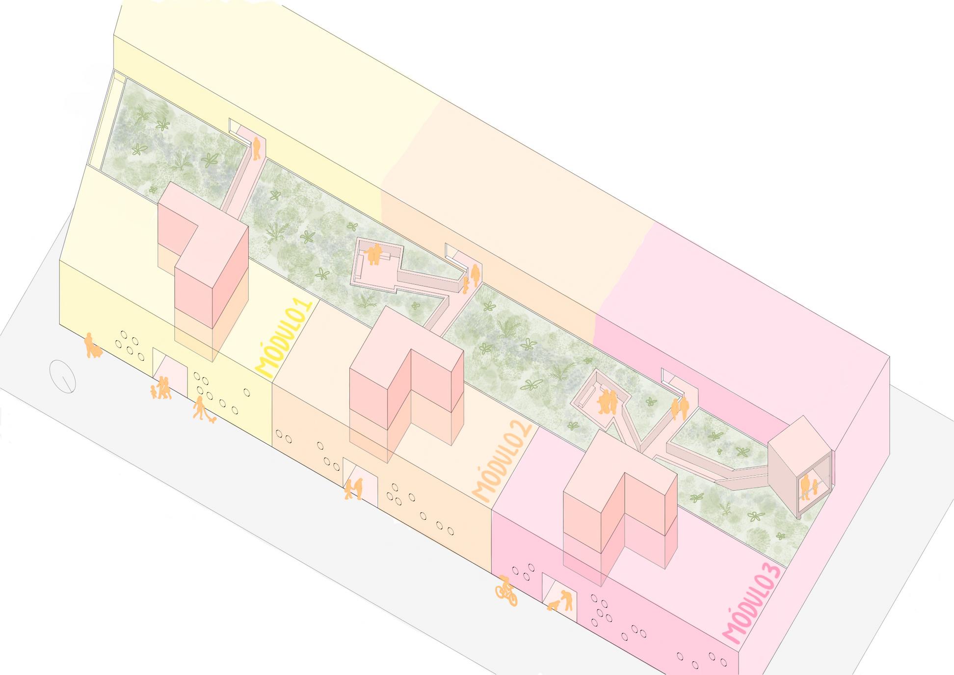 Para lograr esto, hemos implementado diversas infraestructuras como escaleras y pasarelas que conectan y salvan las alturas entre los diferentes patios. Esta disposición busca generar un recorrido visual y sensorial interesante, ofreciendo una experiencia atractiva para quienes lo transitan.