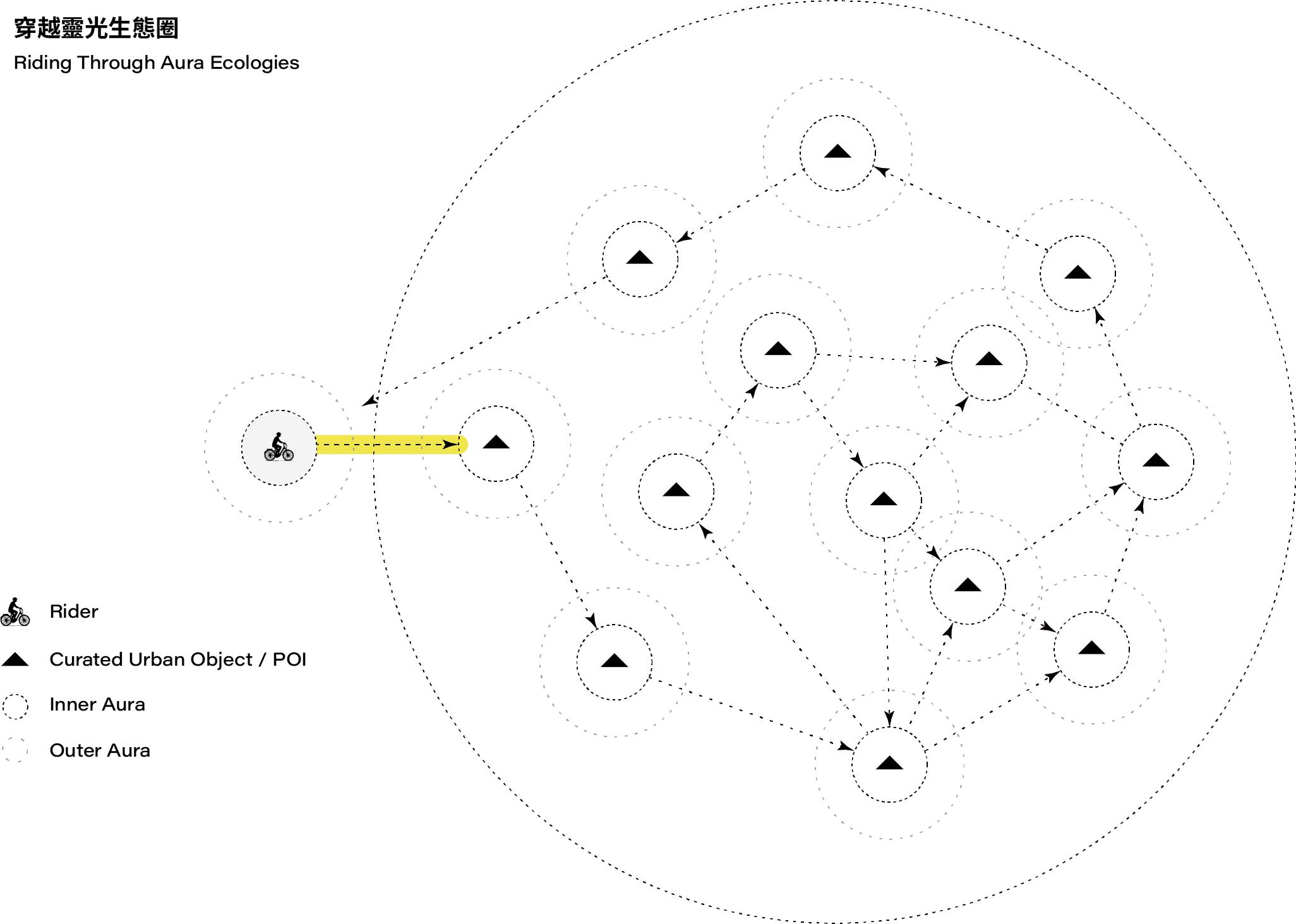Aurora 的概念基底「靈光的迴響」( Echoes of Aura )意 指,在一個充滿靈光體( Aura Entities )的地方生態圈中, 微移動的過程可被視為一種「感知的流動」。當人騎行於地 景之間並與沿途的地方景物交會互動時,雙方的關係會隨著 距離變化而產生不同的能量狀態。這種由遠至近、由陌生至 相遇、再由靠近到離開的循環過程,象徵人與地方之間一種 漸進的相互感知關係,也是一種由「被察覺」到「被理解」 的心理與感官旅程。