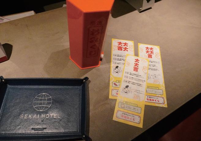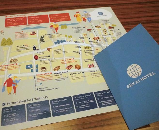 打造「一泊十食」,將飲食體驗分散至街區中 有別於一般飯店推廣的「一泊二食」(住宿一晚,含早餐、晚 餐),SEKAI HOTEL 主張 「一泊十食」,也就是住宿一晚, 但「飯店的餐廳」遍佈在整個商店街中,引導旅客依照飯店引 導展開小鎮漫遊,前往咖啡廳、居酒屋、大阪燒店、澡堂等不 同店舖消費或用餐,獲得更真實的「生活型觀光」。