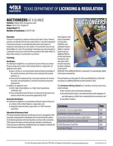 Overview: A license is required to conduct auctions by live bid in Texas. Internet auctions are exempt from the law, unless there is a live bid component. A licensed auctioneer is entrusted by both sellers and buyers of property to sell property at a fair auction. The auctioneer may not use false bidders at a sale. The auctioneer must place any sale proceeds in a separate trust account and remit the proceeds to the seller within 15 days of the auction, or as directed in a contract. Licensing Auctioneer An individual is eligible for an auctioneer’s license if they are at least 18 years of age and a citizen of the United States or a legal alien. An applicant must either: ● pass a written or oral examination demonstrating knowledge of the auction business and of Texas laws relating to the auction business; or ● show proof of employment by a licensed auctioneer for at least two years and participation in at least 10 auctions during that employment. In addition, an applicant must: ● hold a high school diploma or a high school equivalency certificate; and ● have completed at least 80 hours of classroom instruction at an auction school with a curriculum approved by TDLR. Associate Auctioneer An individual is eligible for an associate auctioneer license if they are: ● a citizen of the United States or a legal alien; and ● employed under the direct supervision of a TDLR-licensed auctioneer. Education & Recovery Fund The Texas Auctioneer Education and Recovery Fund is managed by TDLR to provide compensation to individuals who are harmed by the actions of a licensed auctioneer who has breached a contract with a consumer. TDLR reviews the balance of the Auctioneer Education and Recovery Fund each year to determine if additional fees are needed to maintain the fund’s minimum balance of $350,000.