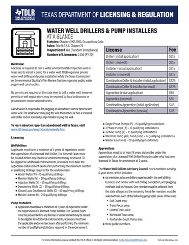 TEXAS DEPARTMENT OF LICENSING & REGULATION WATER WELL DRILLERS & PUMP INSTALLERS AT A GLANCE
