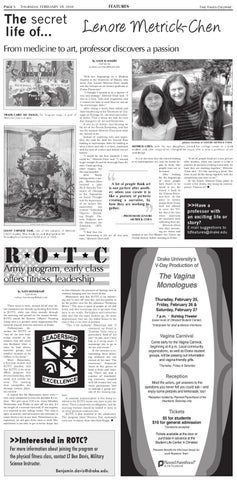 With her beginnings as a Medical Student at the University of Illinois, who knew that Lenore Metrick-Chen would one day become an art history professor at Drake University? “I thought I wanted to be a doctor—I was into biology,” Metrick-Chen said. “I was in a class, Cells and Organelles, and it trained me how to read what we saw on the microscopic slides.” After taking a break from school and then transferring to the University of Chicago, in Chicago, Ill., she went into cultural studies. That is where she took the class that changed it all: Art and Revolution. It was an art history class focusing on the art of the French Revolution, and that was the moment Metrick-Chen knew what she wanted to do. Instead of exploring cells and organelles, she took the skills she learned from photos courtesy of LENORE METRICK-CHEN looking at microscopic slides by looking at what is there and why it is there, combined METRICK-CHEN, with her two daughters, started her college career as a med with her love of culture and delved into art student and, after isnspiration, changed her major. She is now a professor of art and design. history. “I would be the best (student) I ever It is at this time that she started looking “A lot of people think art is one picture could be,” Metrick-Chen said. “I wanted to get straight As and be thorough from the in to contemporary art, and the search be- after another; when you curate it is like a gan to study why journey of pictures creating a narrative, by start. I kept quitting people want art to how they are working together,” Metrickother majors, but be moral. Chen said. “It’s like opening a book. You this was heartfelt.” After looking have to put all the things together, with the After finally for the beginnings connections you start to see.” locking down a maof what people In the future, Metrick-Chen plans to jor, Metrick-Chen have found to be curate a few shows, one being on contemA lot of people think art received a joint moral in art, she porary Chinese art. n Ph.D. from the Uniis one picture after anothtraced it back to versity of Chicago er; when you curate it is the Chinese Excluin the Committee like a journey of pictures sion Acts. At that on Social Thought point in history, creating a narrative, by and the department people from China of art history. Her how they are working towere not allowed dissertation was gether. to enter the U.S. entitled “Collecting but that is the time Objects/ Excludwhen American – PROFESSOR LENORE ing People: Chiart museums were nese Subjects and METRICK-CHEN collecting their art. the American Art Metrick-Chen Discourse, 1879E-mail suggestions to also likes oversee1900.” ing art shows and “I find that the tdfeatures@drake.edu most fascinating is the art of our own worked at the Des Moines Art Center on Grand Avenue before working at Drake. time,” Metrick-Chen said.