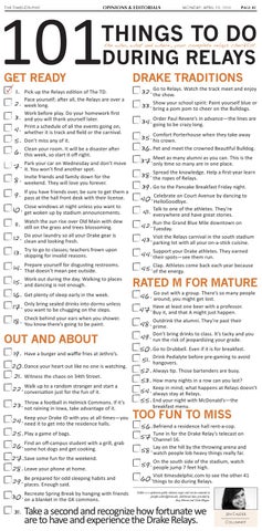 timesdelphic.com to see the other 41 60.Visit things to do during Relays. Calder is a sophomore public relations major and can be contacted at jennifer.calder@drake.edu. Additional ideas provided by Amy Harren and Colin Hagan.