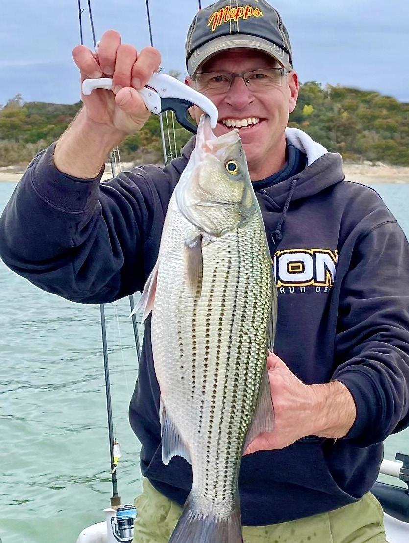 Bob Maindelle, owner and operator of Holding the Line Fishing Guide Service, holds a hybrid bass he pulled out of Belton Lake. Fish caught through Maindelle’s guide service are released after the catch. Courtesy photo