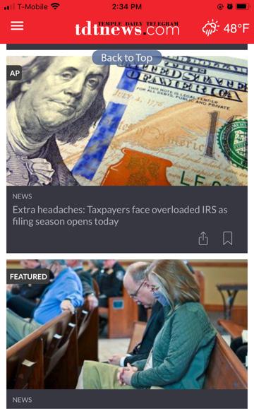 Temple Daily Telegram, Temple, Texas Page 12 FRIDAY, February 24, 2023 Questions? Call 254-778-4444 get local news 24/7 Selected statewide as the best newspaper site of its size…for 2 consecutive years! with an online subscription from the Temple Telegram Scan to get started today! Only$9 per month!