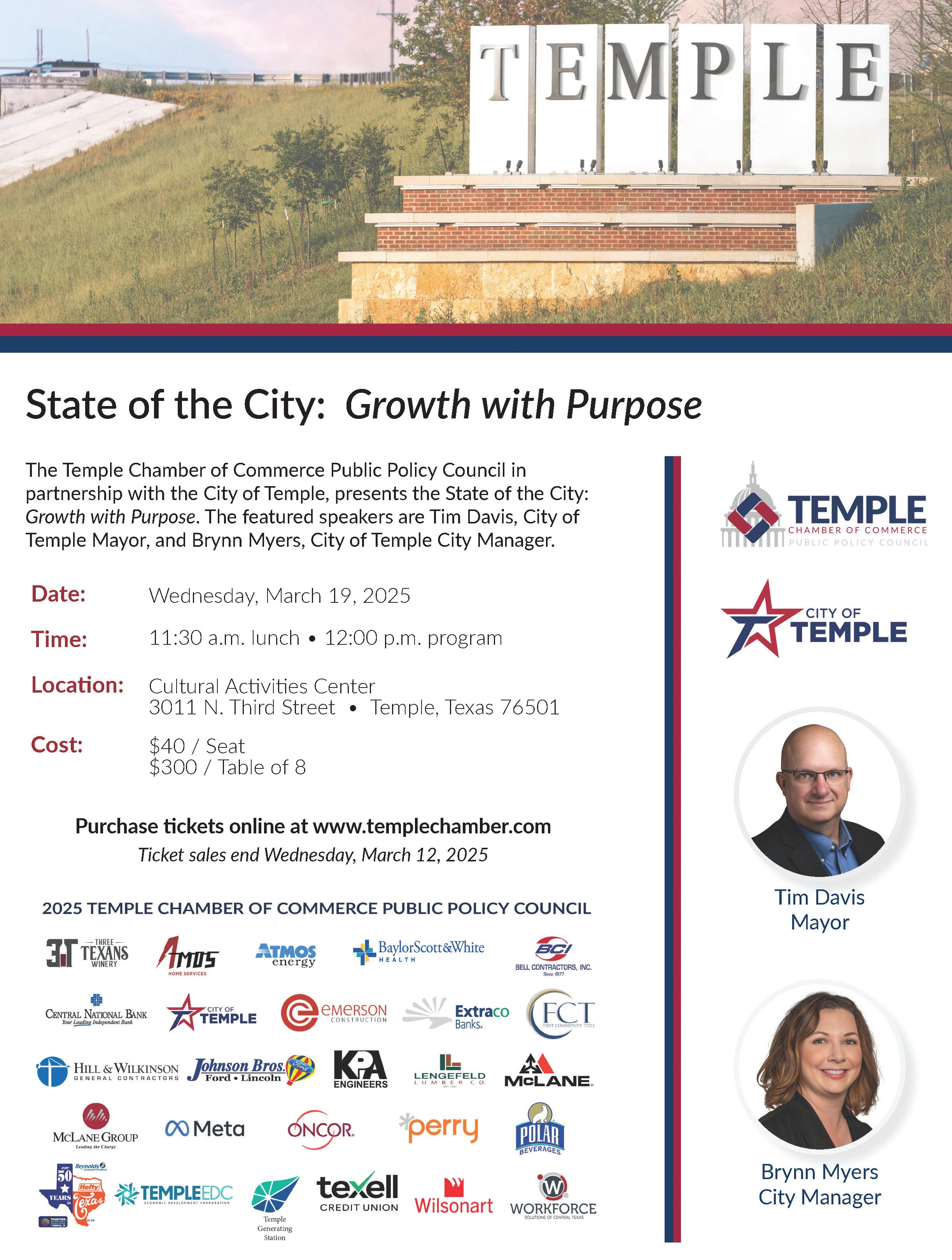 Don't miss out on this opportunity to be part of the State of the City luncheon. The Temple Chamber of Commerce Public Policy Council looks forward to welcoming you to this event, celebrating the convergence of civic leadership and local businesses within the City of Temple.