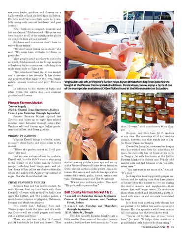 Tractor Supply 2002 E. Central Texas Expressway, Killeen 9 a.m.-2 p.m. Saturdays (through September) Pioneer Farmers Market opened last October and hosts up to eight farm-related vendors every Saturday through Labor Day. Vendors sell local honey, eggs, baked goods, jams and jellies, and Texas produce. Virginia’s Garden Virginia Kessell brings her herbs, mints, rosemary, dried herbs and spice mixes to the market. “When the garden comes in, I sell produce,” she said. Last year was not a good year for produce, Kessell said, but she didn’t want to stop going to the market so she began making flavored syrups, including basil syrup, jams and jellies. Some of her jellies are diabetic-friendly, which she makes with Agave syrup instead of sugar. She also blends herbal teas. CHEeK Flavored Pickles Rebecca Bass and her mother-in-law, Pamela Stevers, heat up taste buds with their hot pickle flavors, such as the Fire Pickle, not quite the hottest, and The Zombie pickle, a much hotter infusion of jalapeño, Habanero, Serrano and Anaheim peppers. “It’s pretty hot,” Rebecca Bass said. “Some people drink the juice and it’s nothing. Others will eat a half pepper and break out in a sweat and tears.” These are just two of the 16 flavored pickles handmade by Bass and Stevers. They