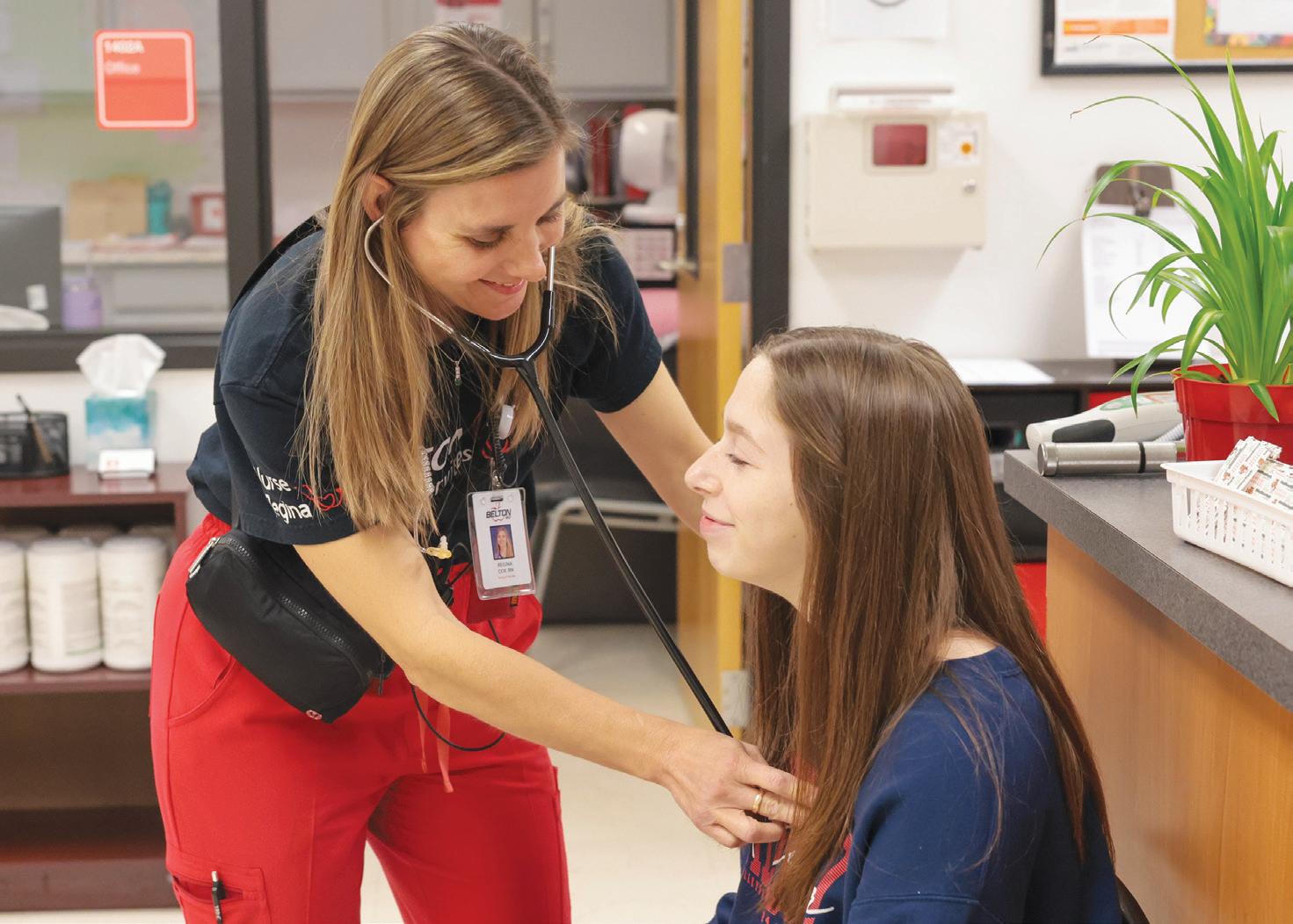 Registered Nurse Regina Cox listens to a co-worker’s heartbeat in the Belton High School health center.