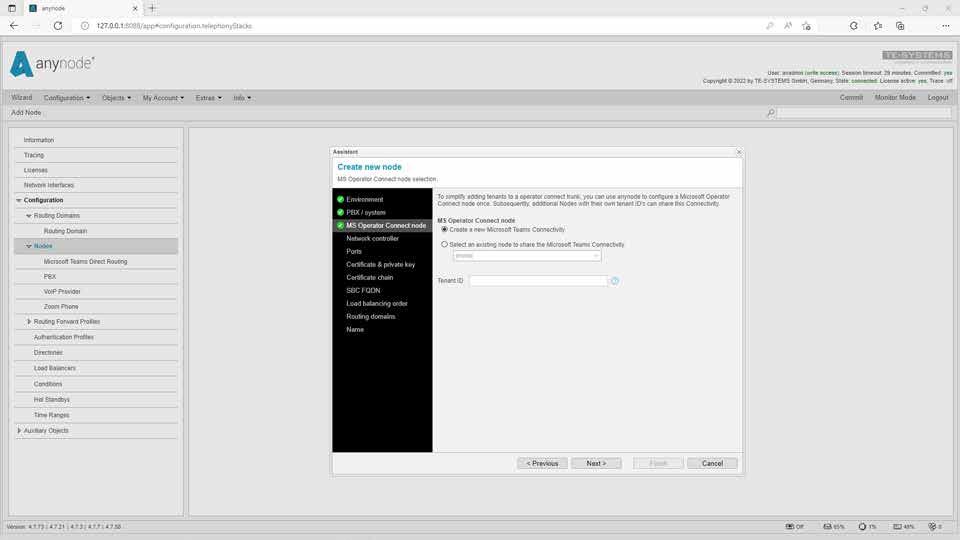 The existing connection option to Microsoft Teams Direct Routing in the anynode frontend has been extended by an additional predefined system profile for Microsoft Operator Connect.
