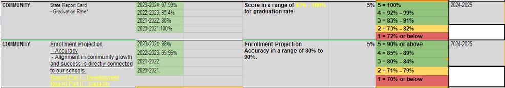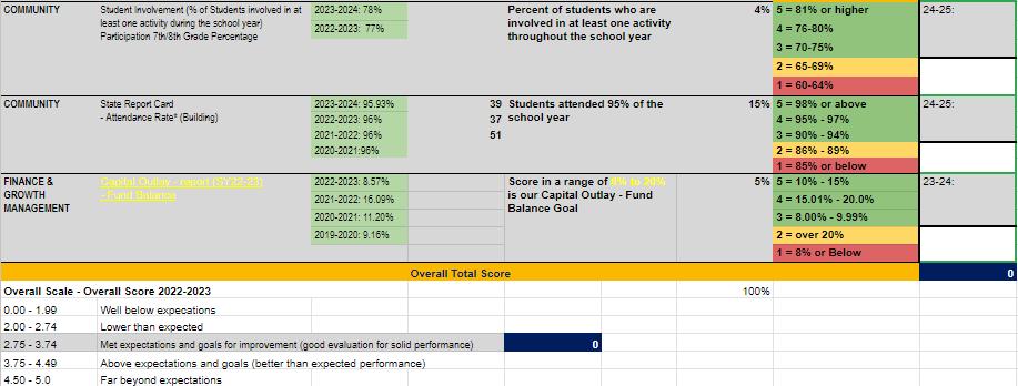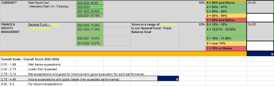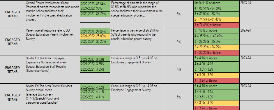 Adopting board policy, ADA Continuous School Improvement, formalized the board's commitment to how we operate at Tea Area. This policy clearly articulates the board's vision and expectations for the culture at Tea Area. From pillars to a living plan, the employees, led by their administrator or director, create, adapt, and operationalize the work through their strategic targets. The targets are measured by their scoreboards, which align directly with the Superintendent’s scoreboard. The scoreboard’s scale and resulting rating clearly outline the goals set by the administrative team and approved by the board annually.