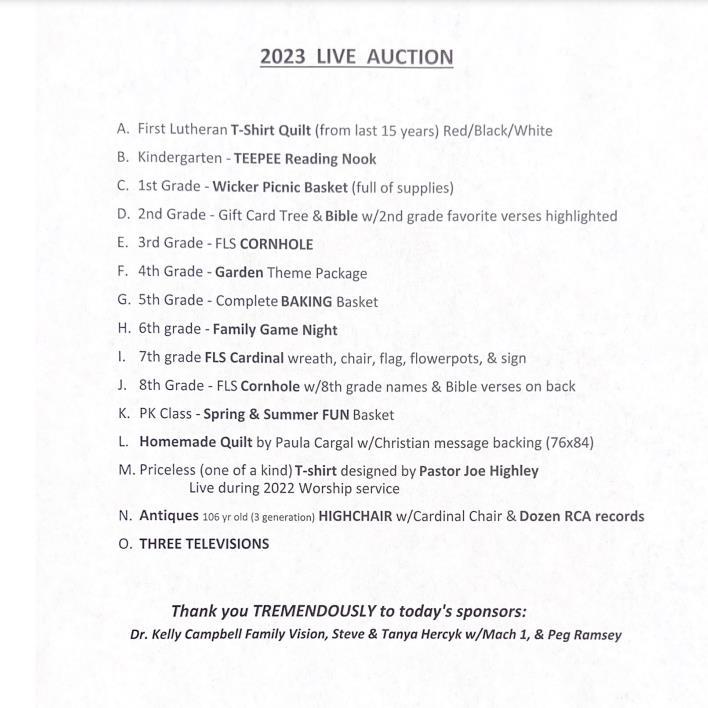 Several Auction Items can be viewed on our facebook page and/or in our office. If you would like to place a bid on any of these items, please message Principal Birnbaum ASAP and he will bid for you Saturday night.