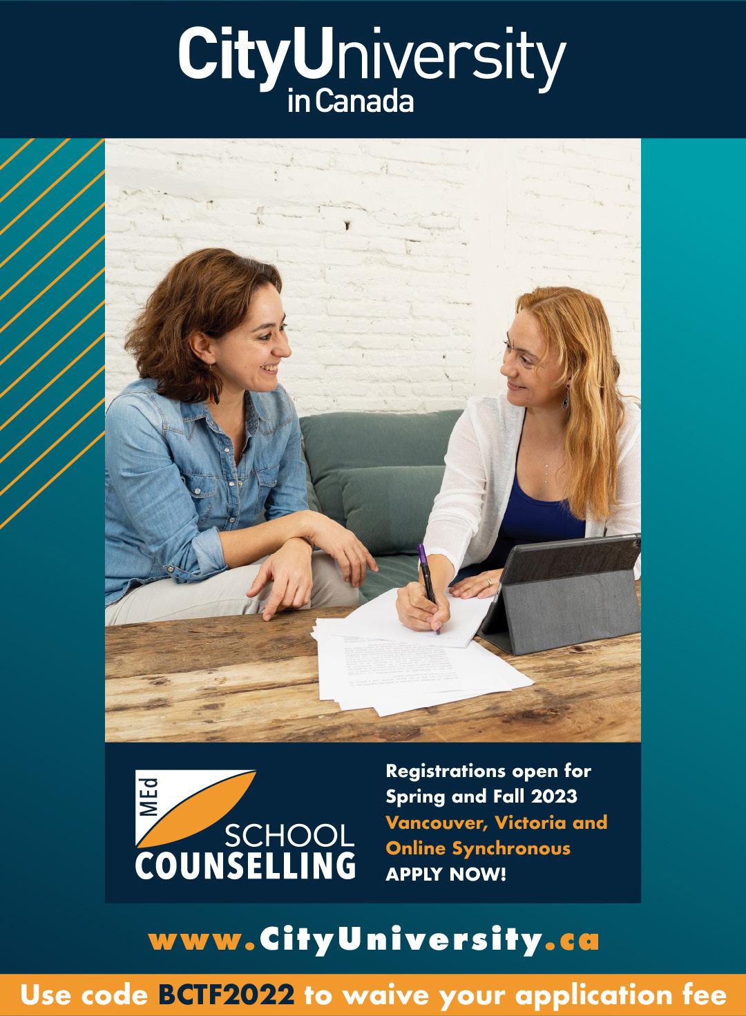 Articles reflect the views of the authors and do not necessarily express official policy of the BCTF. The BCTF does not endorse or promote any products or services advertised in the magazine. Advertisements reviewed and approved by the BCTF must reflect BCTF policy and be politically, environmentally, and professionally appropriate.