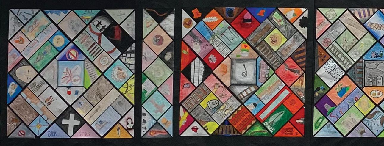 OPPOSITE AND PAGES 10–11: Photos of student art and assembled witness blanket provided by author. teacher living and working on theunceded, ancestral, and traditionalterritories of the Pilalt, Ts'elxwéyeqw, and Semá:th people in Chilliwack