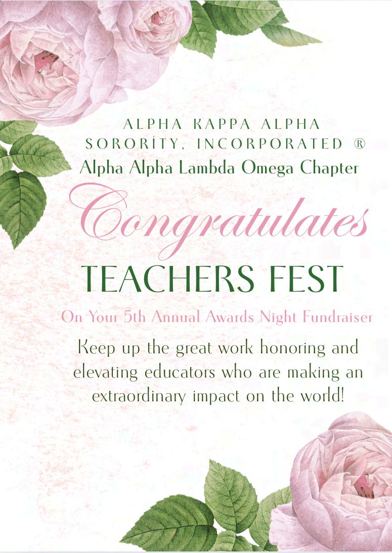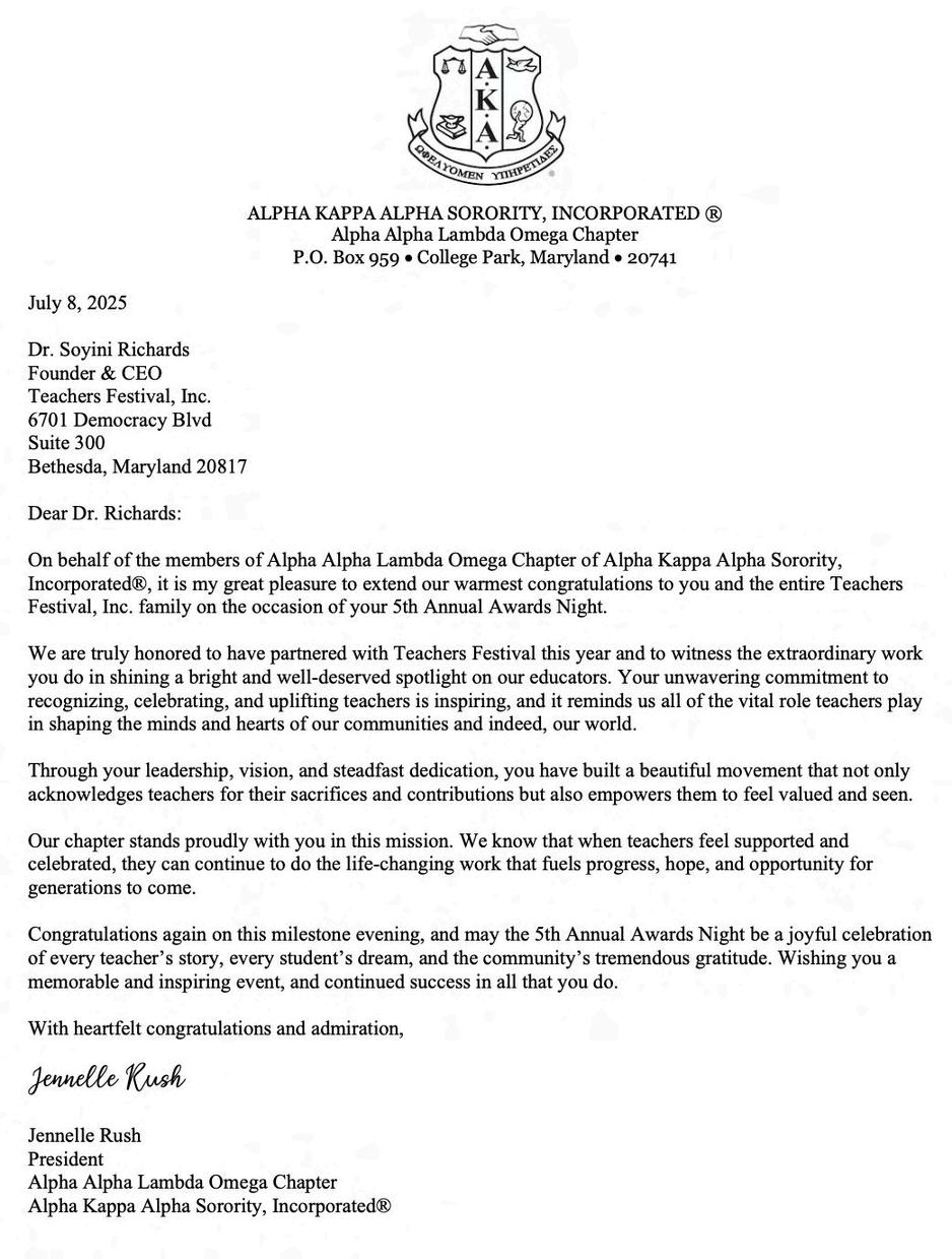 Welcome to the 5th Annual Teachers Festival Awards Night Fundraiser, taking place at the esteemed Howard University, my alma mater, in Washington, DC. As the founder of Teachers Festival Inc., a proud 501(c)(3) nonprofit organization, and on behalf of our Board of Directors, it is my sincere pleasure to welcome you and celebrate this meaningful evening together.