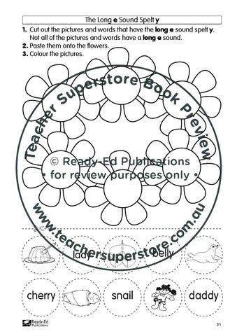 1. Cut out the pictures and words that have the long e sound spelt y. Not all of the pictures and words have a long e sound. 2. Paste them onto the flowers. 3. Colour the pictures.
