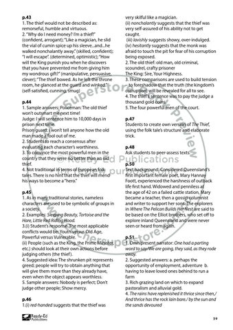very skilful like a magician. (ii) nonchalantly suggests that the thief was very self-assured of his ability not to get caught. (iii) lavishly suggests showy, over-indulged. (iv) hesitantly suggests that the monk was afraid to touch the pit for fear of his corruption being exposed. 2. The old thief: old man, old criminal, scoundrel, crafty prisoner The King: Sire, Your Highness. 3. These comparisons are used to build tension – to foreshadow that the truth (the kingdom’s corruption) will be revealed for all to see. 4. The thief’s sentence was to pay the judge a thousand gold coins. 5. The four powerful men of the court. p.47 Students to create own version of The Thief, using the folk tale’s structure and elaborate trick. p.48 Ask students to peer-assess texts.