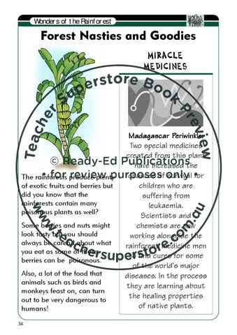 Two special medicines created from this plant © ReadyEdPuhave bl i c at i ons increased the chances of o survival for •f orproduce r evi eplenty w pur poses nl y• The rainforests children who are of exotic fruits and berries but did you know that the suffering from rainforests contain many leukaemia. poisonous plants as well? Scientists and Some berries and nuts might chemists are now look tasty but you should working alongside the always be careful about what rainforest medicine men you eat as some of those to find cures for some berries can be poisonous. of the world’s major Also, a lot of the food that diseases. In the process animals such as birds and they are learning about monkeys feast on, can turn the healing properties out to be very dangerous to of native plants. humans!