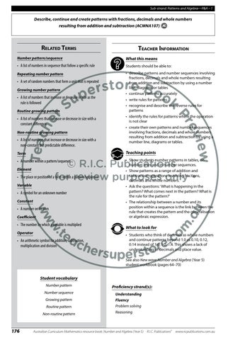 • describe patterns and number sequences involving fractions, decimals and whole numbers resulting from addition and subtraction by using a number line, diagrams or tables • continue patterns accurately • write rules for patterns • recognise and describe the reverse rules for patterns • identify the rules for patterns where the operation is not clear • create their own patterns and number sequences involving fractions, decimals and whole numbers resulting from addition and subtraction by using a number line, diagrams or tables.