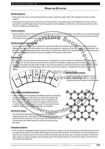 HANDS-ON ACTIVITIES Number patterns • Photocopy onto card, cut out and laminate the number cards from pages 186 to 196. Separate the cards to create patterns. • Create patterns using fractions, decimals and whole numbers. Use addition (plus) and subtraction (minus) moves in your pattern. Include single-step and multi-step patterns with addition or subtraction, and multi-step patterns with a mixture of addition and subtraction.