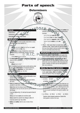 • Determiners are useful for making information more precise for the reader or listener. • Distributive determiners are usually used before the noun. • Each and every have similar meanings and it’s often possible to use either of them. Each often but not always means everyone separately or one by one and can be used for one of two things. It can be followed by ‘of’ and can be used in front of a verb. Every can mean each and sometimes all. Every cannot be used for two things or after ‘of’. It can be used to say ‘how often’ • Either and neither refer to one or none of two things. Primary grammar and word study