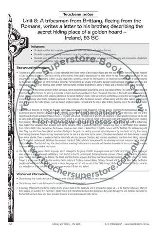 Unit 8: A tribesman from Brittany, fleeing from the Romans, writes a letter to his brother, describing the secret hiding place of a golden hoard – Ireland, 53 BC Indicators: Students read text and complete comprehension and cloze exercises based on the text. Students complete word study exercises in correcting spelling and choosing correct answers.