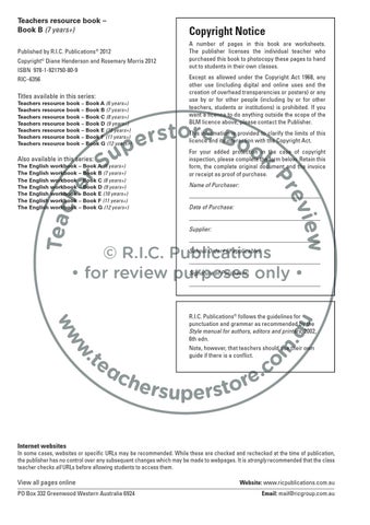 R.I.C. Publications® follows the guidelines for punctuation and grammar as recommended by the Style manual for authors, editors and printers, 2002, 6th edn. Note, however, that teachers should use their own guide if there is a conflict.