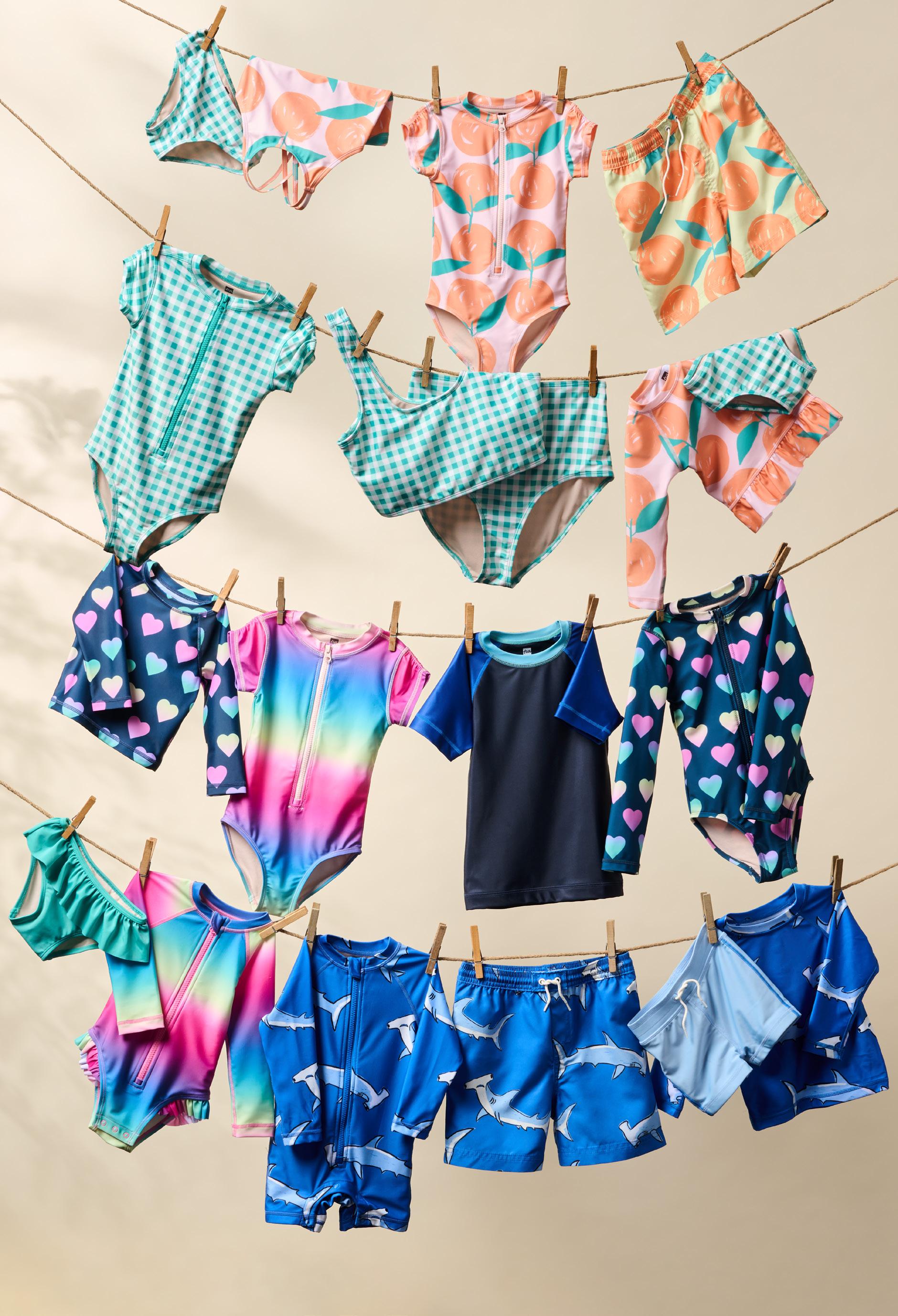New! Baby swimsuits include snaps for easy diaper changes.