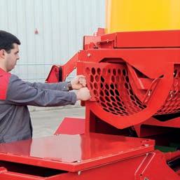 Einklappbare Seitenteile ermöglichen einen runden Zuführtrichter der innerhalb der gesetzlichen Vorschriften für den Straßentransport bleibt und eine problemlose Beladung mit Front- oder Teleskopladern bietet. Der Kettenantrieb des Zuführtrichters ist mit einer automatischen Ölung ausgestattet.