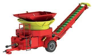 Die beiden hydraulisch angetriebenen Austrags- und Überladeband minimieren Staub. Die maximale Überladehöhe beträgt 4,6 m, mit dem optionalen Leitblech können Anhänger Verlustfrei beladen werden. Das Überladeband wird bequem aus der Traktorkabine hydraulisch eingestellt.