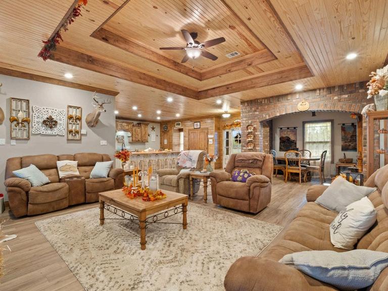 *Custom-Built Oasis on 35 Acres Just Minutes from Town* Discover your dream home on 35 scenic acres, just a short drive from town. Built only 5 years ago, this custom residence blends modern luxury with rustic charm. The open floor plan features elegant wood cabinets and doors throughout, while the dining area showcases a striking brick archway. The cozy living room centers around a fireplace framed by double tray wood ceilings. With 4 bedrooms and 4 baths, there's plenty of space for family and guests. Perfect for entertaining, the expansive back porch offers ideal outdoor living space. Car enthusiasts will love the 4-car carport, and a 30x50 shop with electricity and concrete floors provides endless possibilities. Two barns and two stocked ponds complete this peaceful retreat. Experience luxury and tranquility in this custom-built haven! Schedule your tour today!