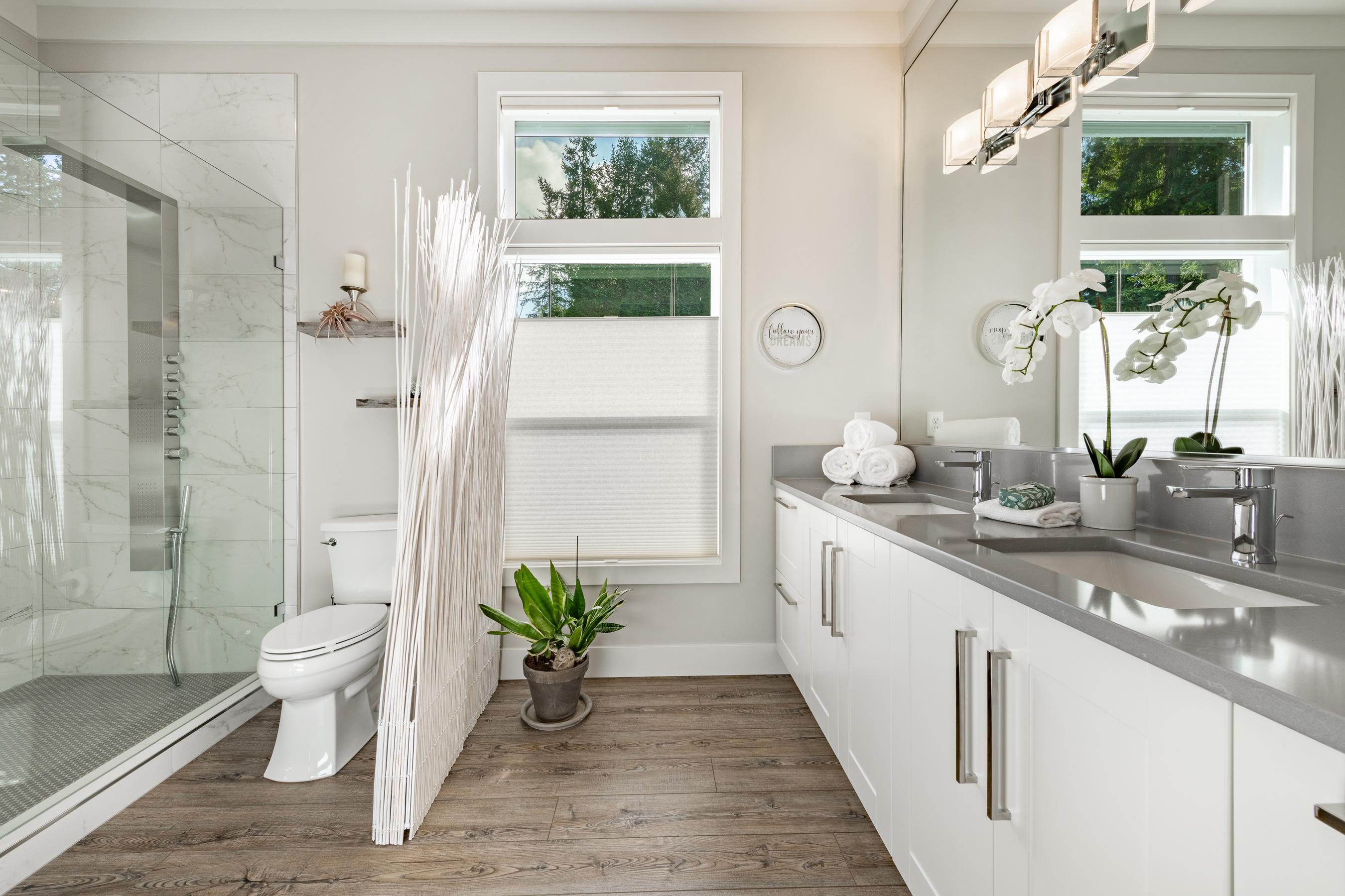 The ensuite features walk-in shower, 8' vanity with double sinks for ample space, and storage for towels or personal items