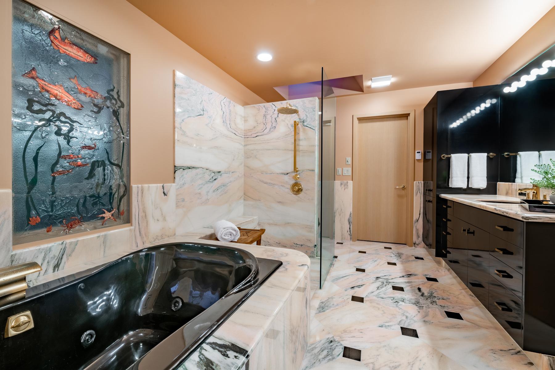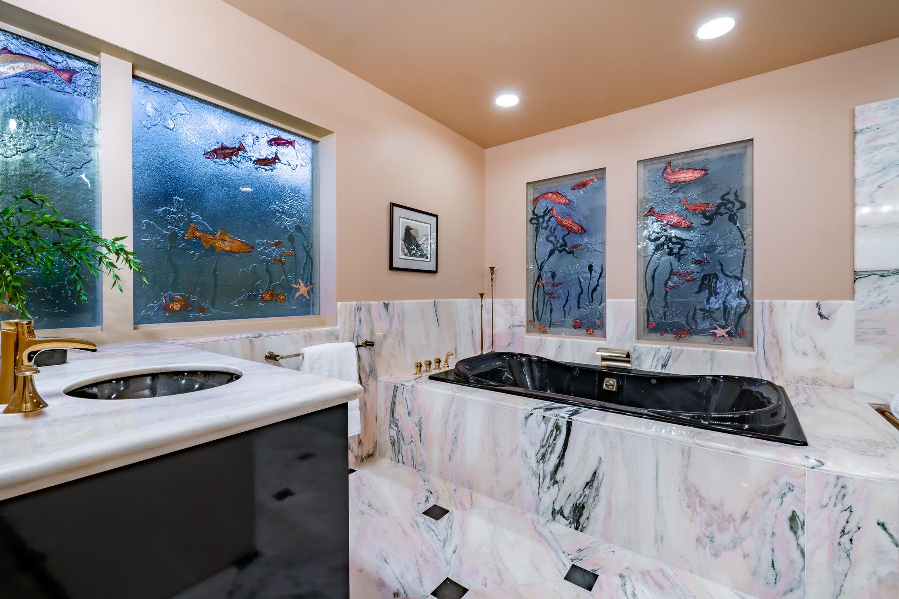 Primary bedroom is spacious with private deck and en suite features Pink onyx stone, walk in shower, spa tub and custom stained glass windows.