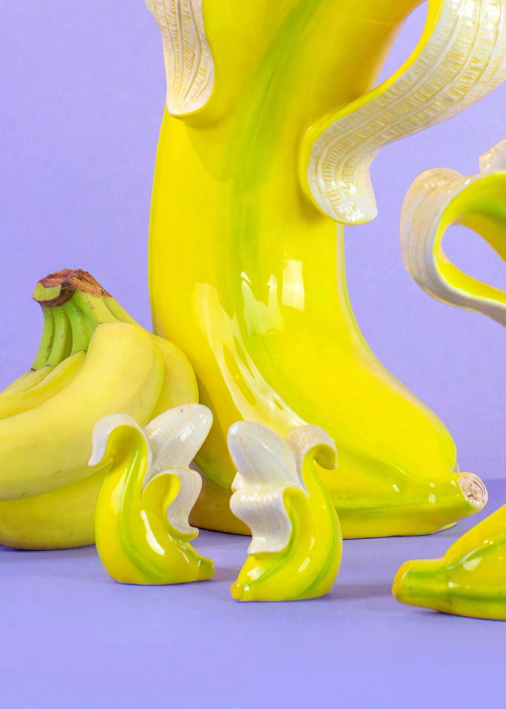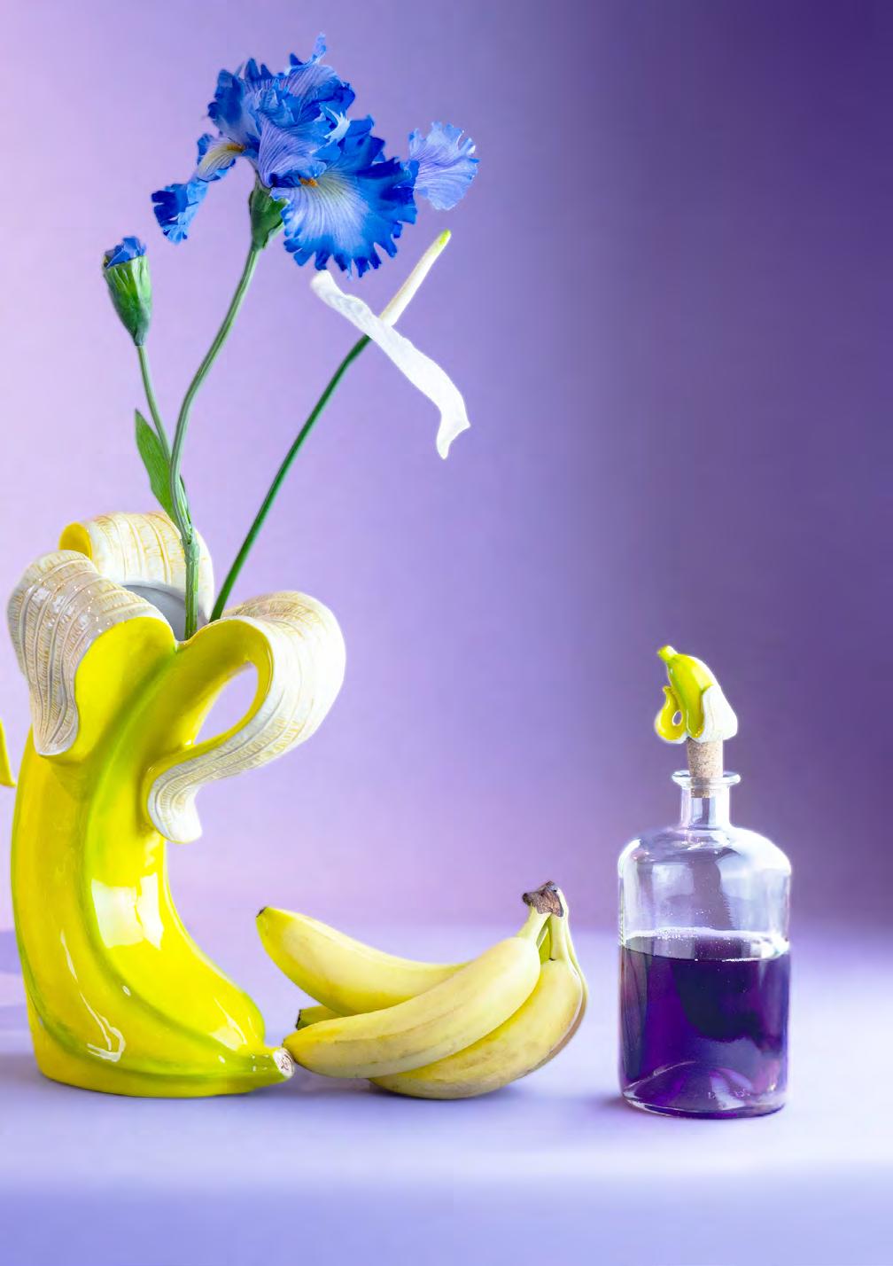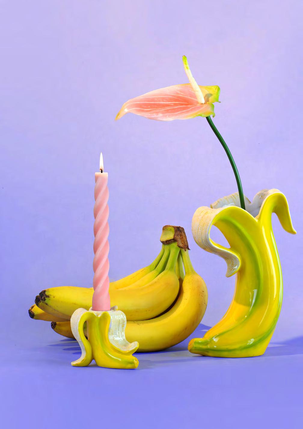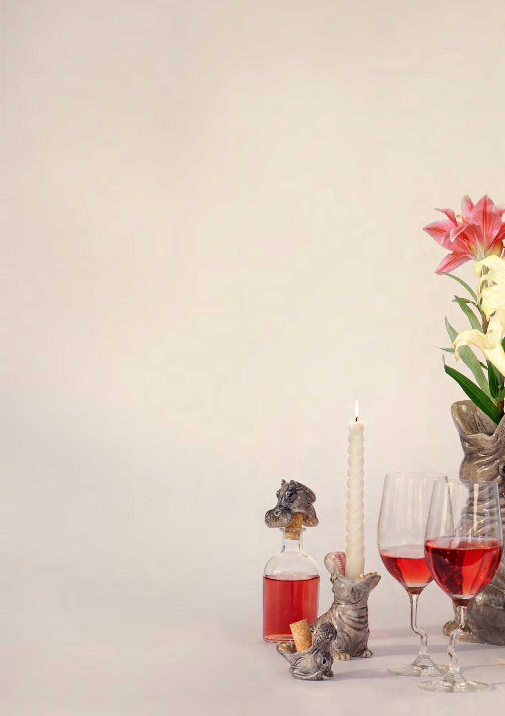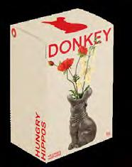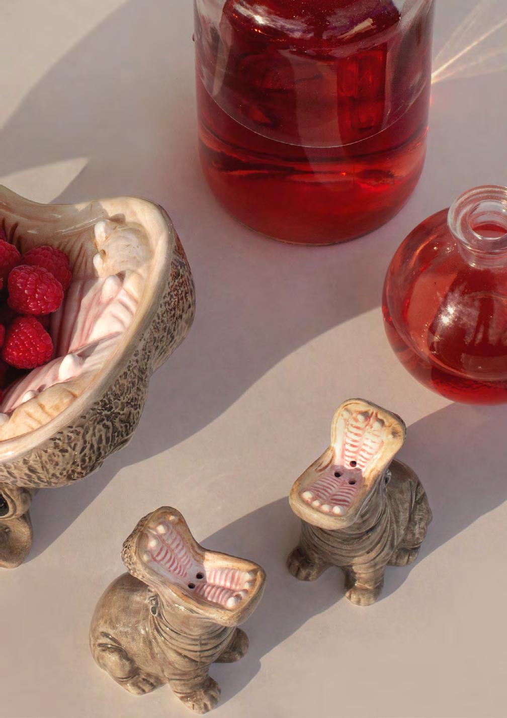 This purely ceramic collection brings a certain opulence back into our homes. Rendering the unusual to the ordinary life is both an inspiration and a challenge for us. The Hungry Hippos with the two vases, the bowl, the candle holders, the bottle sealer and the salt and pepper shakers take this alienation to the extreme.