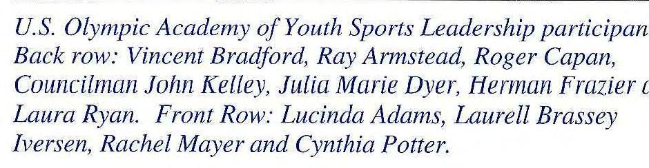 U.S. Oly mpic Academy of Youth Sp o rts L ea dership participants: Ba ck row: Vincent Bradford, Ray Armstead, Roger Capan, Councilman John Kelley , Julia Marie Dyer, fferman Fra zier and Laura Ryan. Front Row: Lucinda Adams, Laurel/ Brassey Iversen , Rachel Mayer and Cynthia Potter