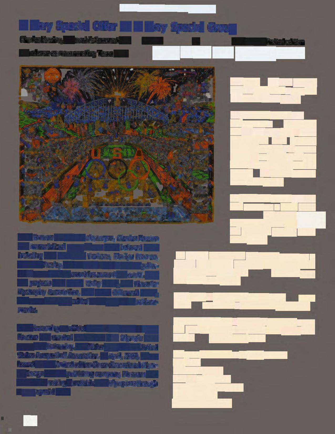 Since becoming an official artist of the USOC in 1999, Fazzino has created art for the U.S. Olympic Congress, USA Swimming, USA Water Polo, and The United States Racquetball Association. In April, 2000, he released his first limited edition three-dimensional Olympic image and his publishing company, Museum Editions Ltd. is making it available to all Olympians through a very special offer.
