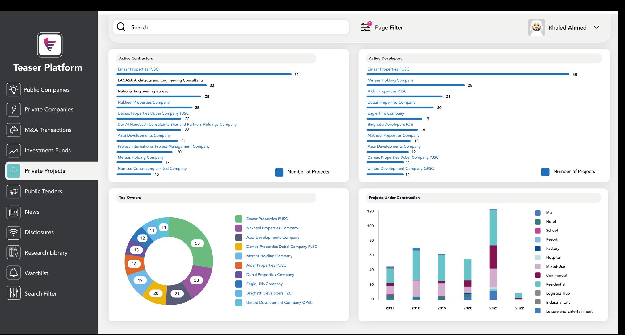 Teaser Platform is a state-of-the-art web-based market intelligence platform that aims to empower MENA investment professionals with the necessary insights, information, and data needed to conduct informed investment decisions. The platform has been designed to satisfy the needs of different type of users like