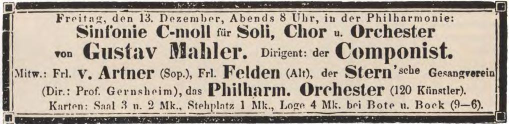 Artista desconocido (1895). Recorte de diario, anuncio estreno "Sinfonía nº2". Mahler foundation. Recuperado de: https://mahlerfoundation.org/wp-content/uploads/2016/03/13-12-1895.JPG