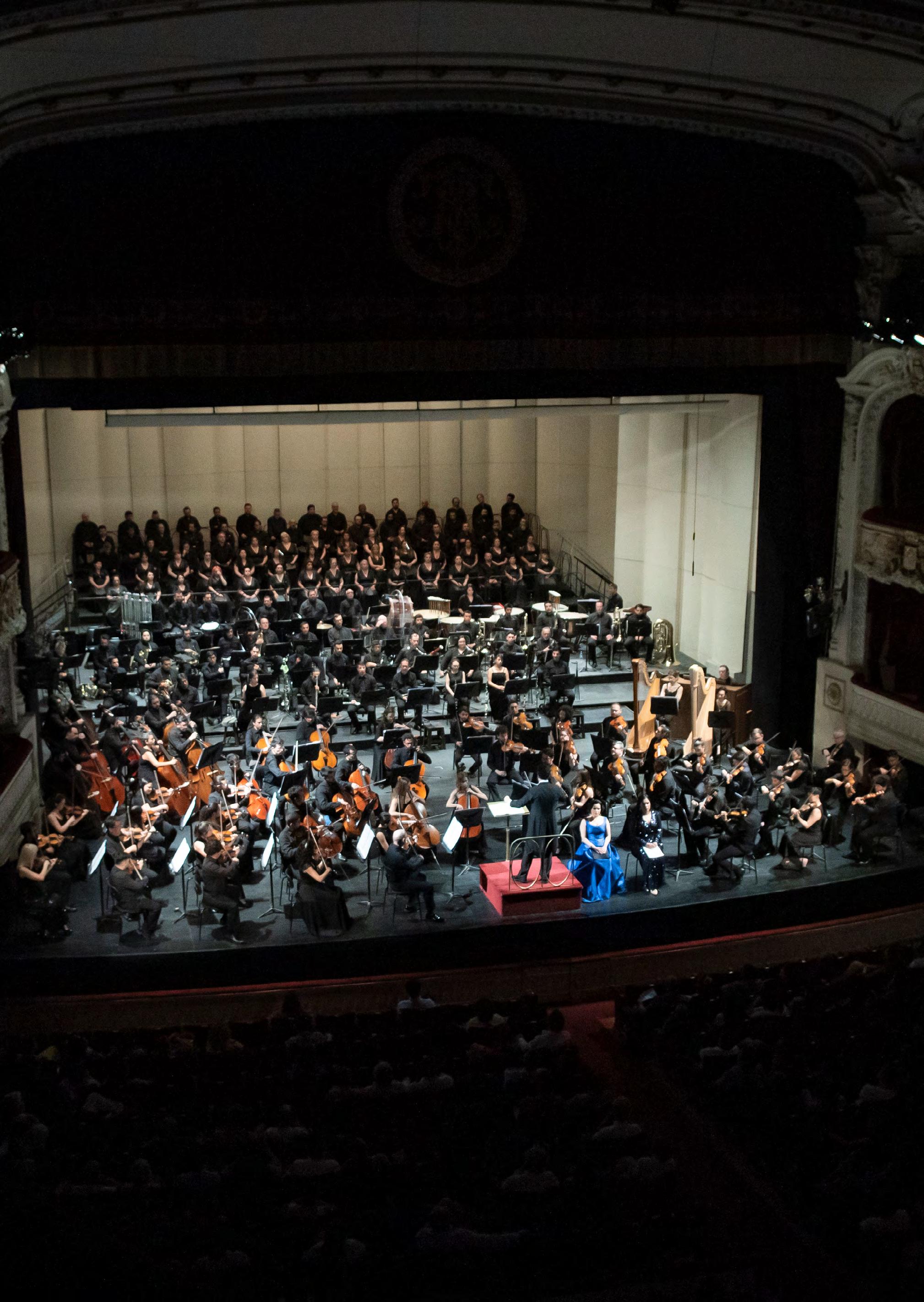 • Su monumental contingente orquestal utiliza instrumentos poco usuales en la sala de conciertos como el órgano y las campanas bajas.
