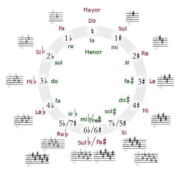 Círculo de quintas. En la imagen, el color rojo representa a las tonalidades mayores y el verde, a las menores. Una modulación común va a los tonos adyacentes del mismo color y a la tónica paralela. Por ejemplo, do mayor puede modular a sol mayor (sentido del reloj), a fa mayor (sentido contrario) o a la menor (la relativa). O bien, sol menor puede modular a re menor (sentido del reloj), do menor (sentido contrario) o si bemol mayor (la relativa).