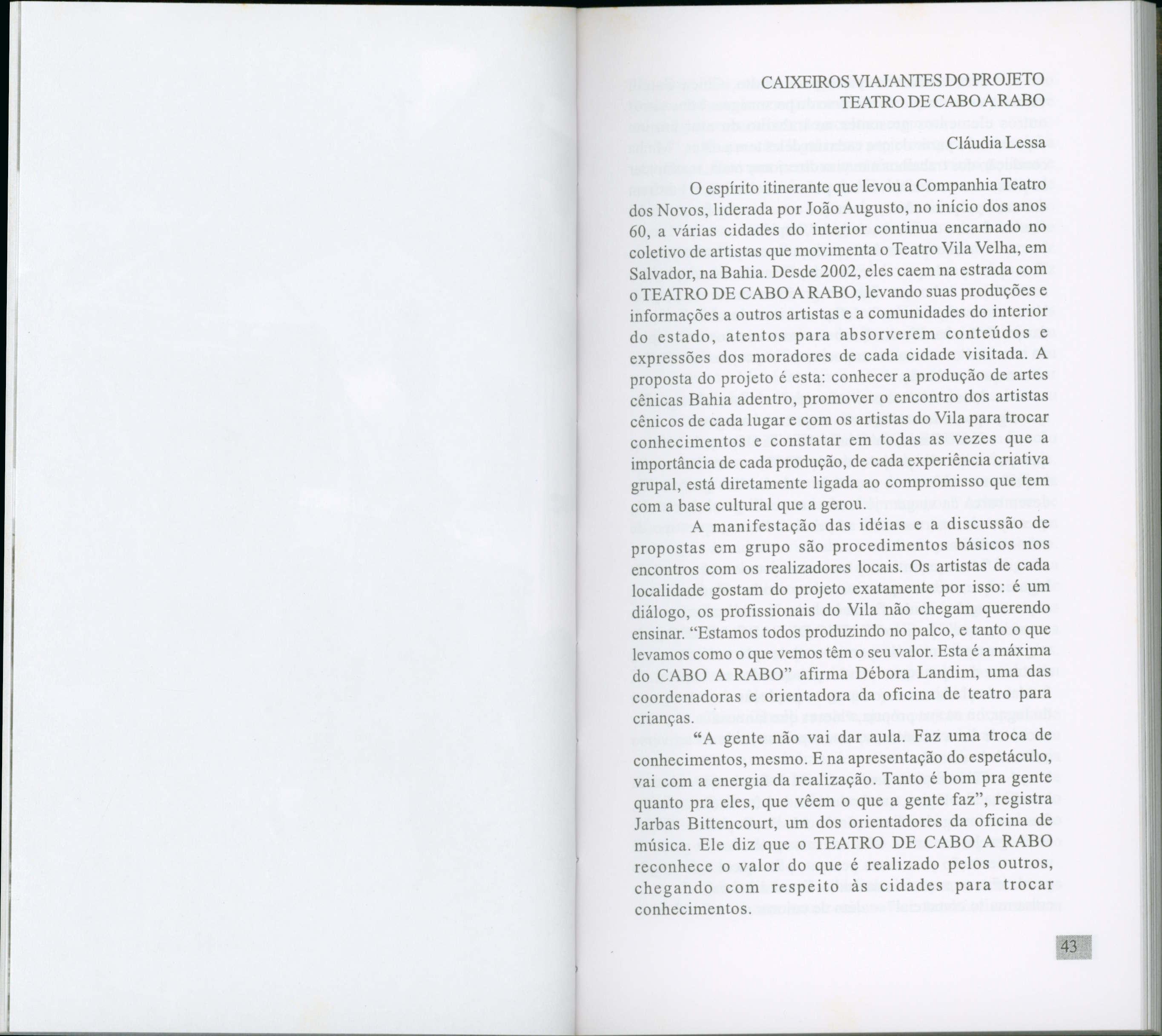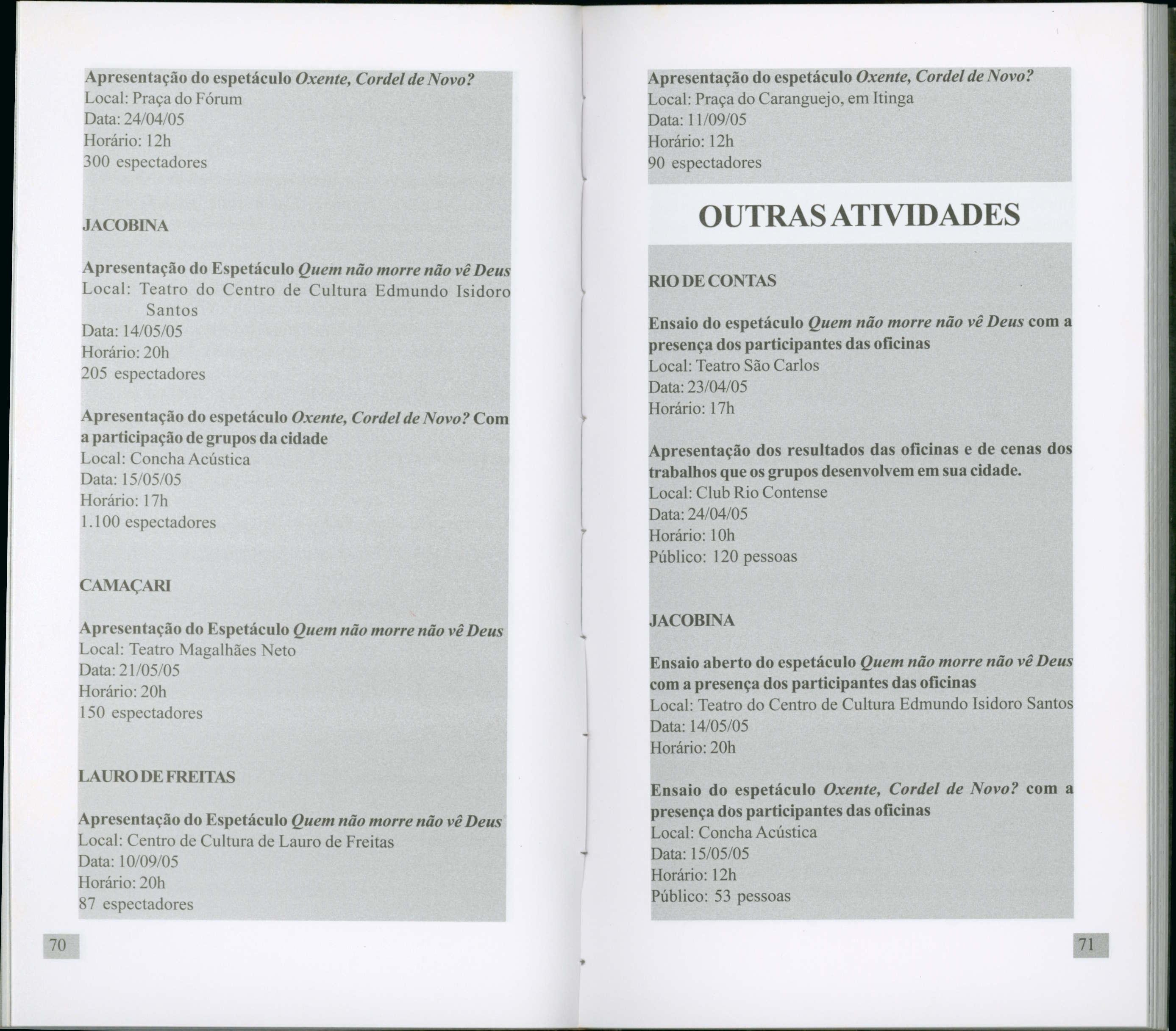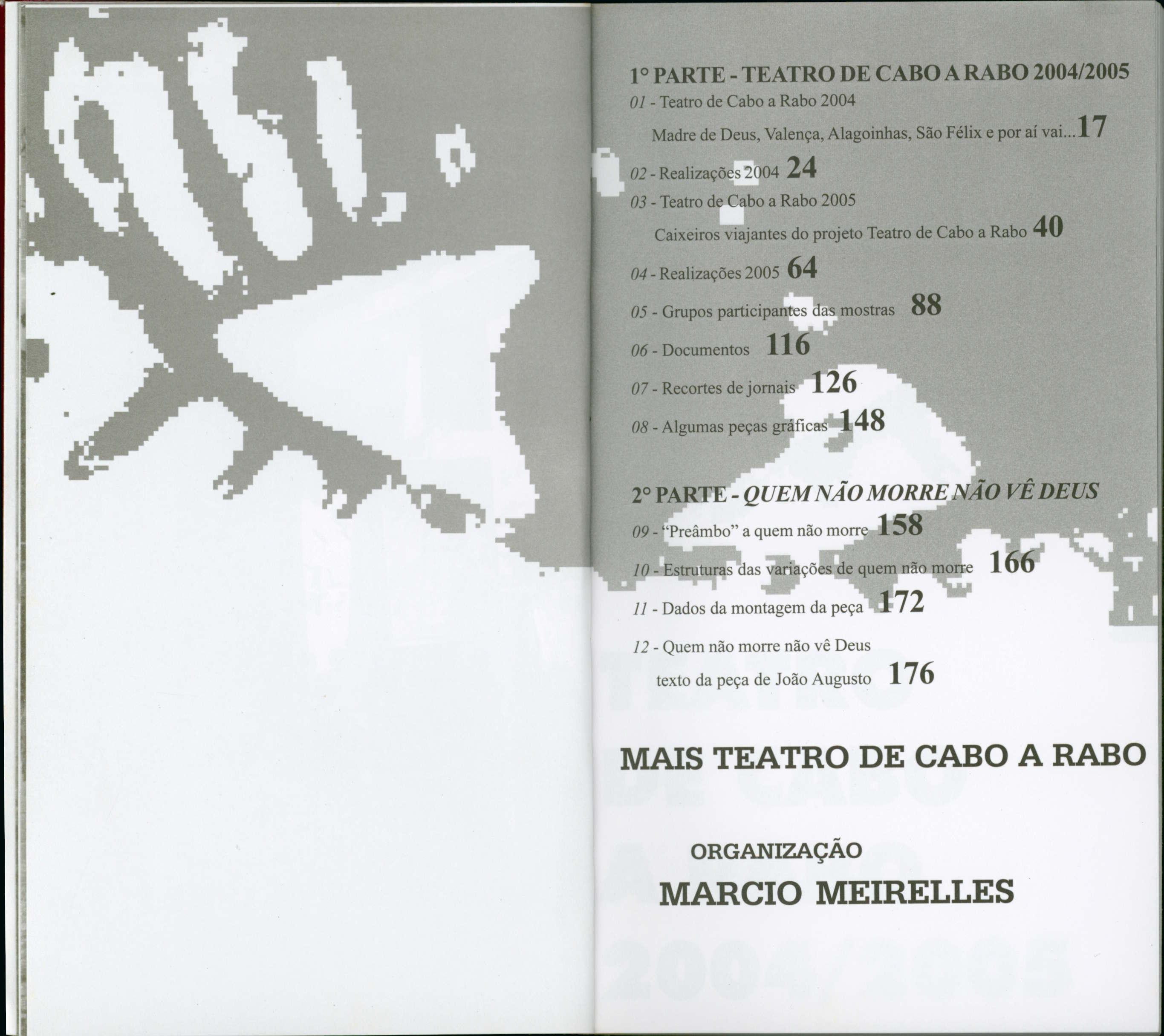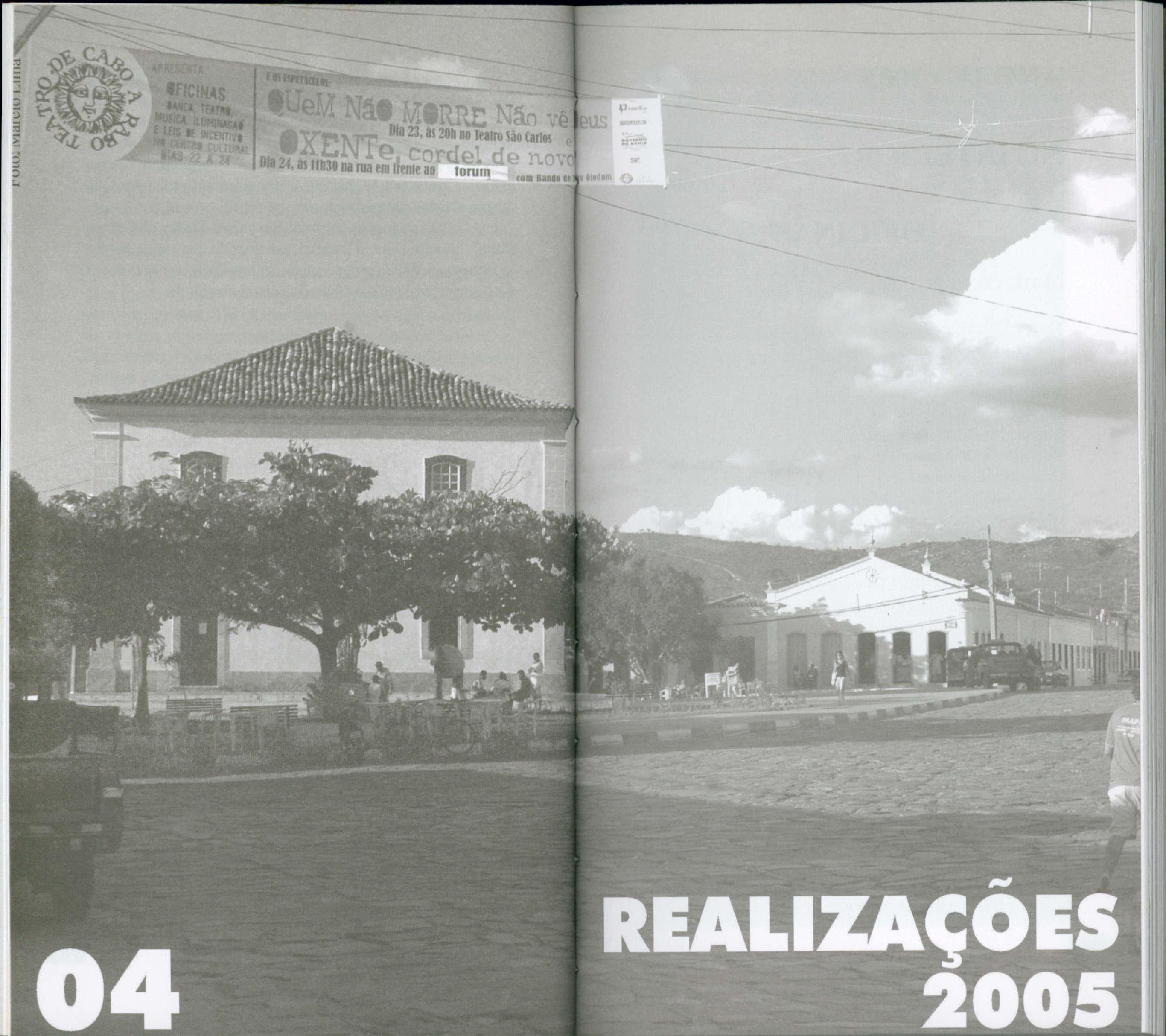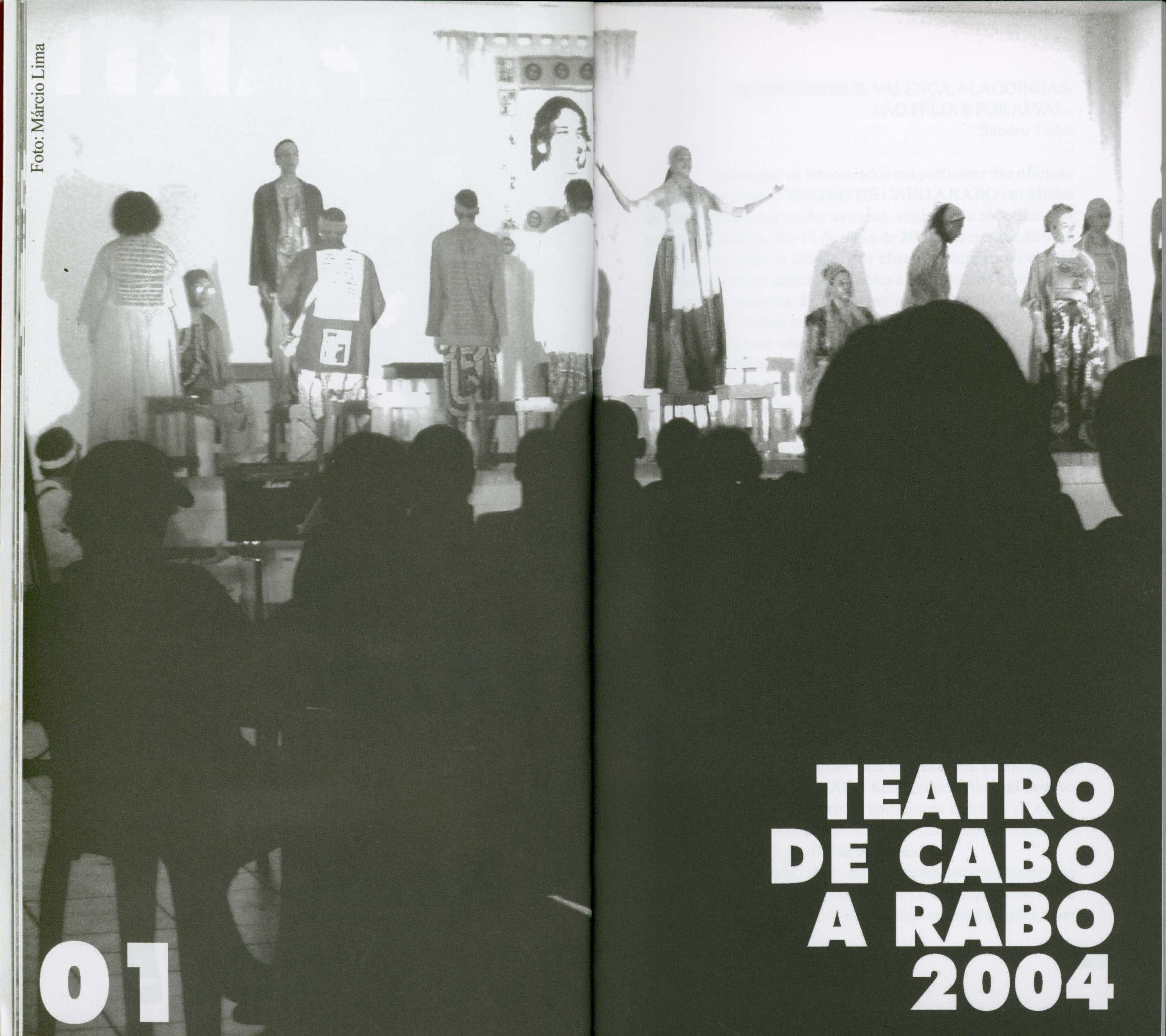 Esse livro reúne anos de práticas, de espetáculos, de encontros que se deram em cidades de nomes sonoros e luminosos. Ano III [2004]: Madre de Deus, Valença, Alagoinhas, São Félix. Ano IV [2005]: Rio de Contas, Jacobina, Camaçari, Lauro de Freitas, Salvador e em tantos outros lugares onde o palco se ergue na praça, o figurino é costurado à mão, a iluminação vem do poste, e o público são os vizinhos, amigos, crianças, passantes.