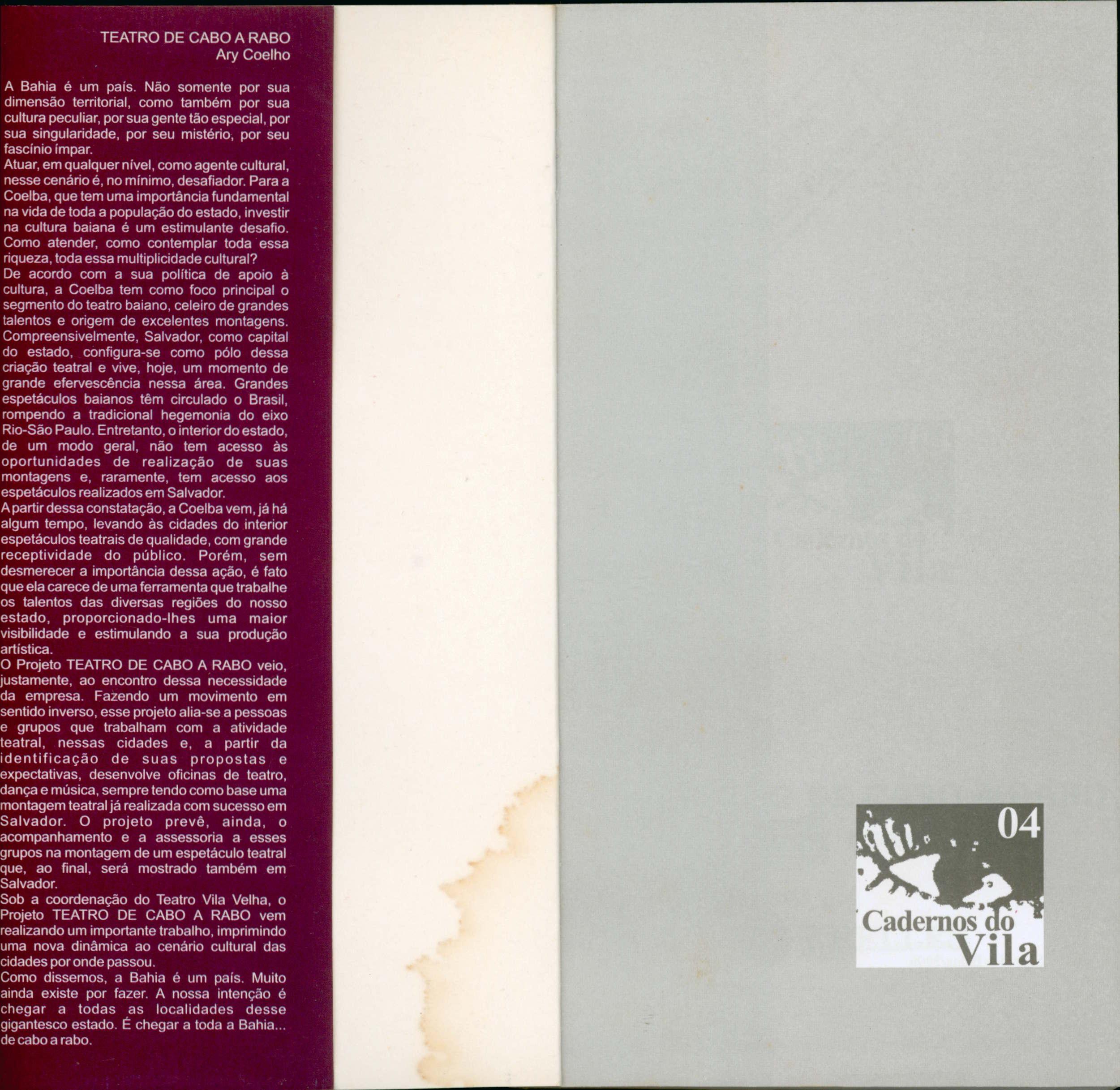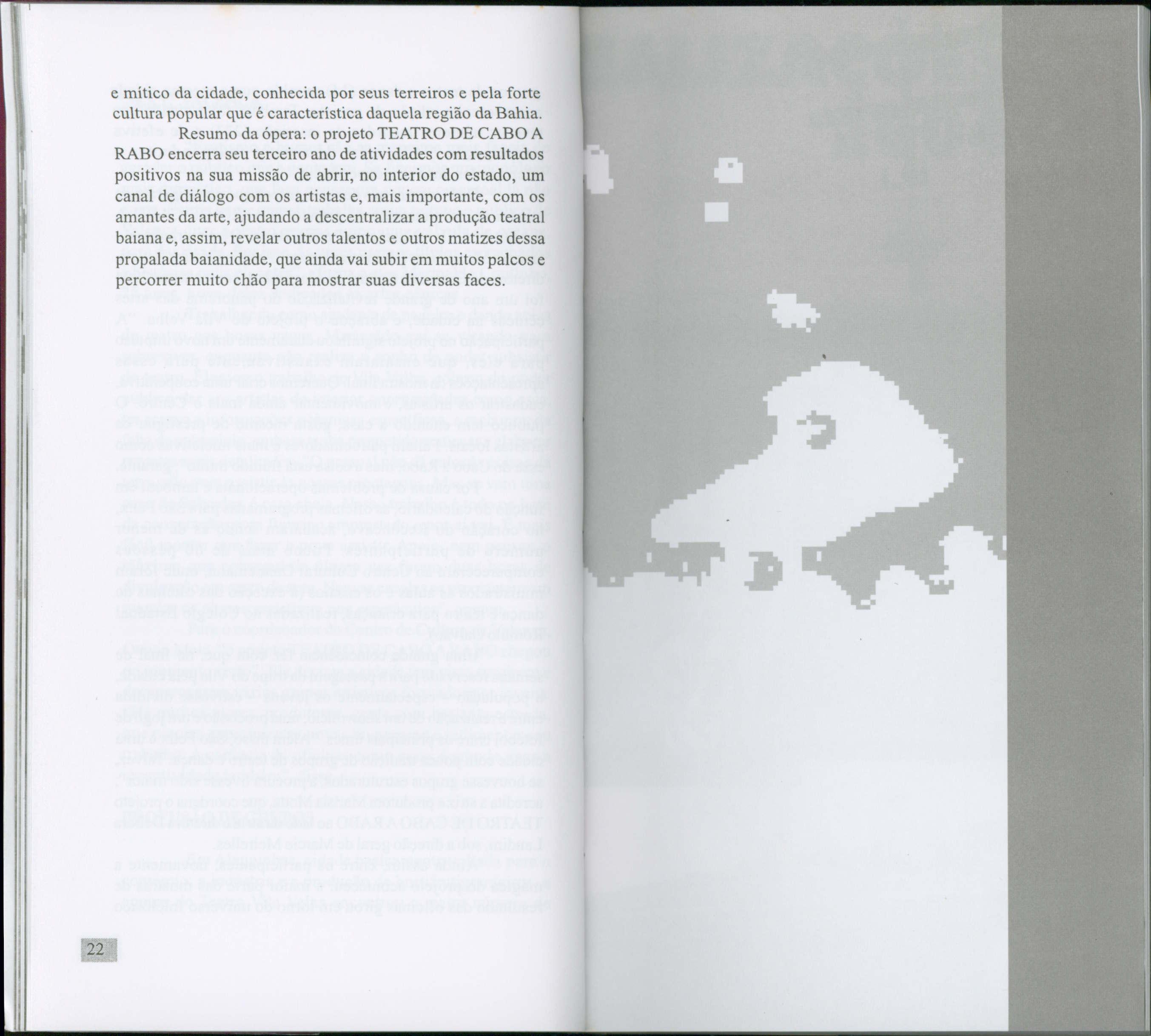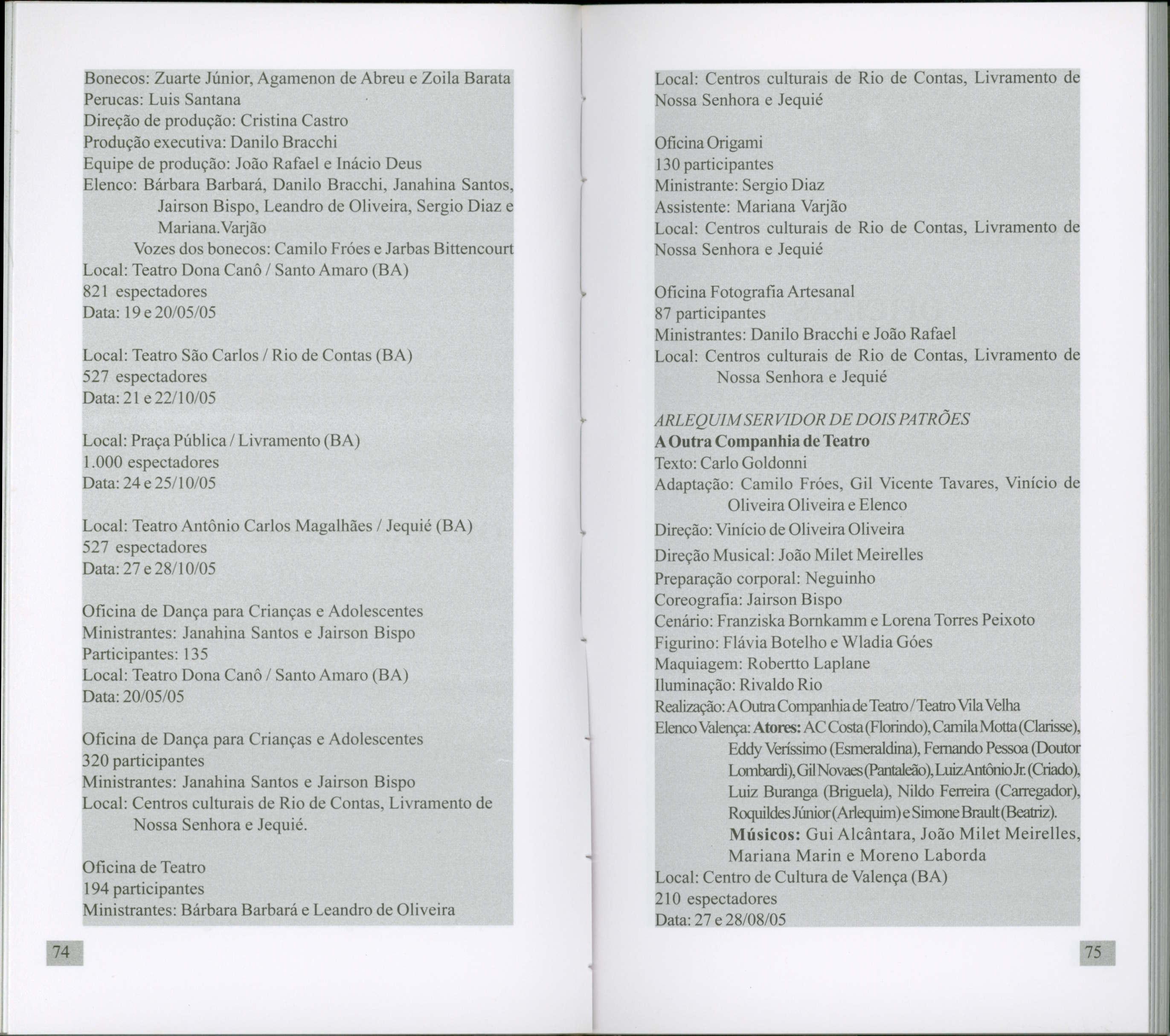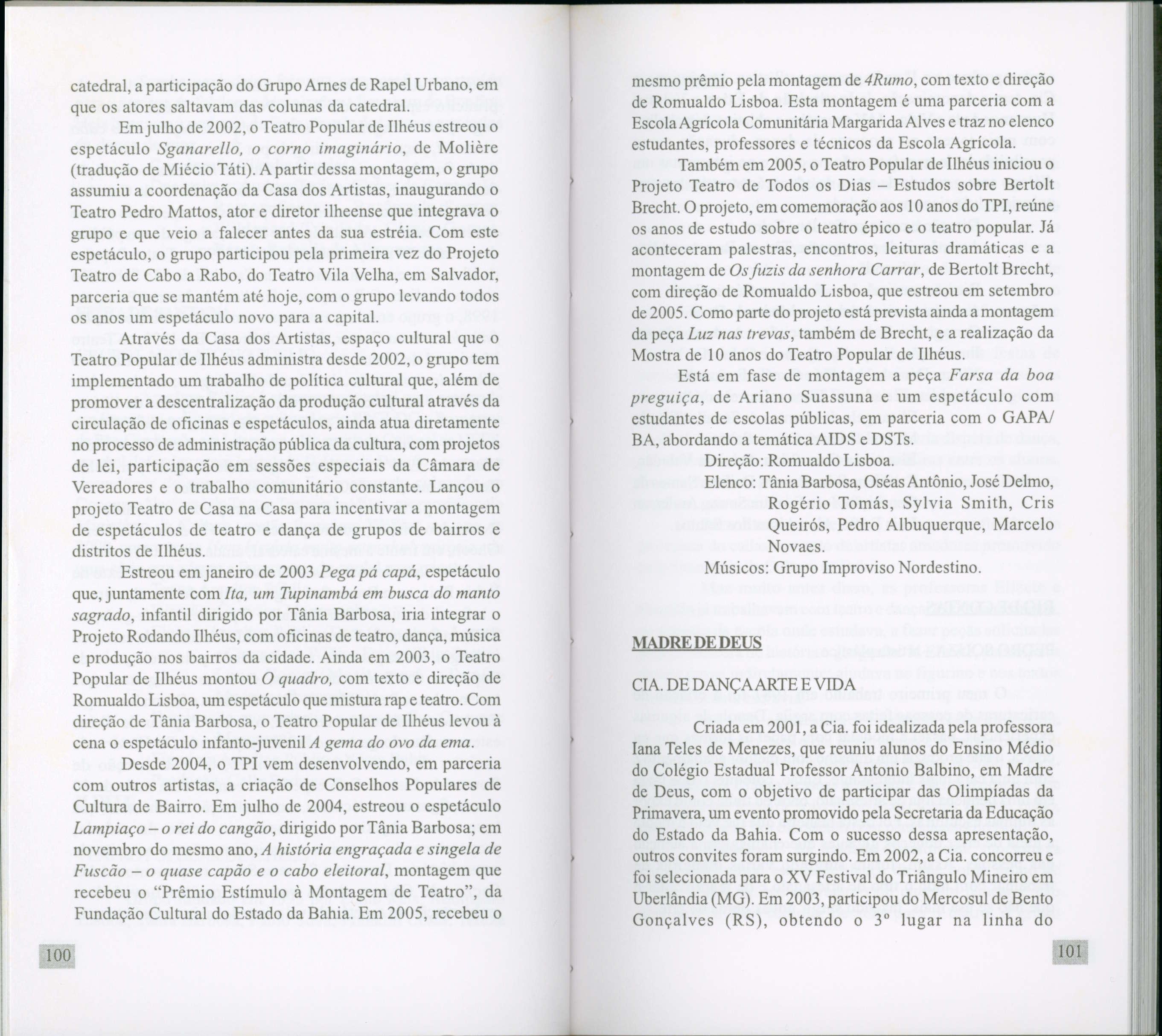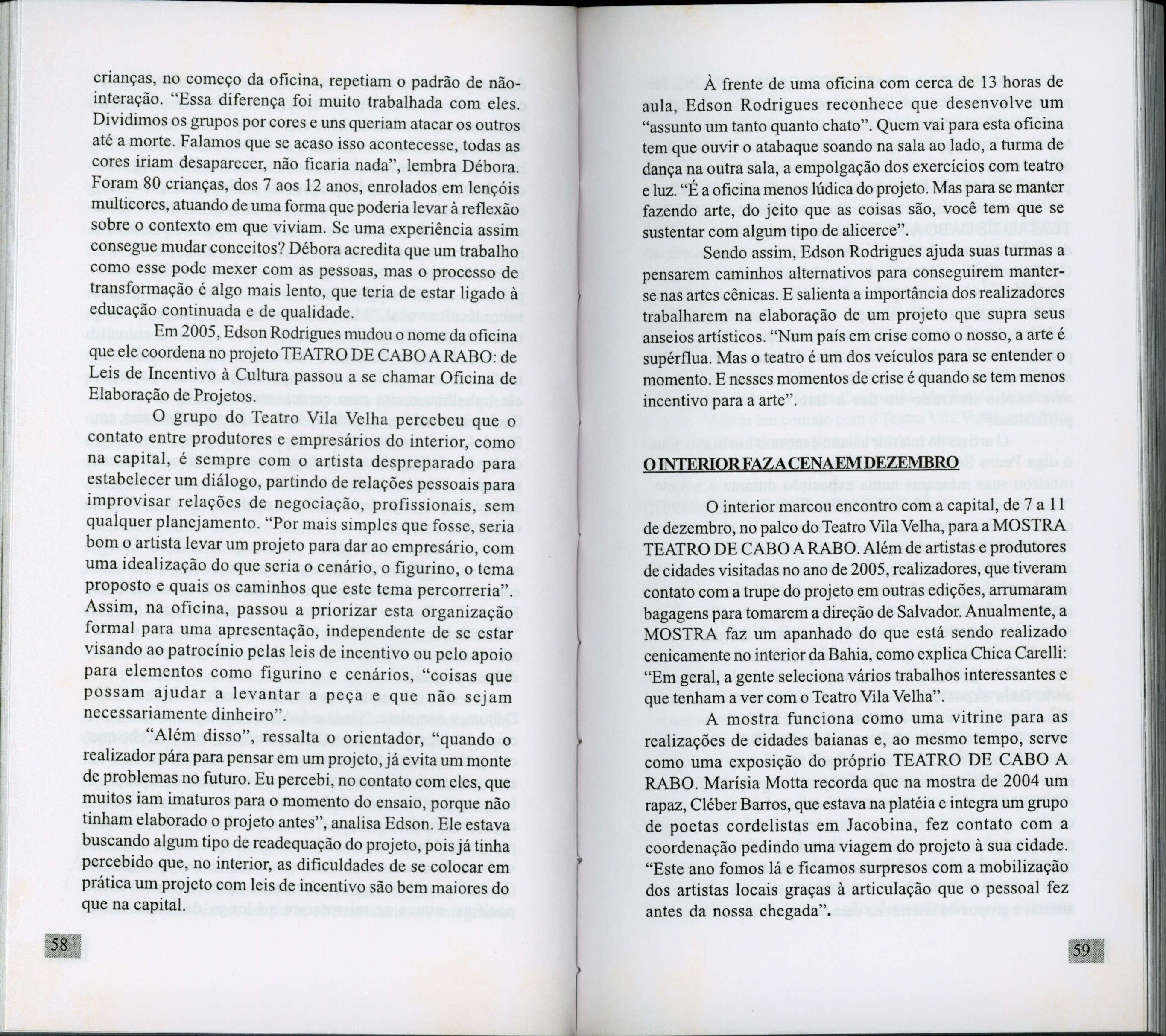 Esse livro reúne anos de práticas, de espetáculos, de encontros que se deram em cidades de nomes sonoros e luminosos. Ano III [2004]: Madre de Deus, Valença, Alagoinhas, São Félix. Ano IV [2005]: Rio de Contas, Jacobina, Camaçari, Lauro de Freitas, Salvador e em tantos outros lugares onde o palco se ergue na praça, o figurino é costurado à mão, a iluminação vem do poste, e o público são os vizinhos, amigos, crianças, passantes.