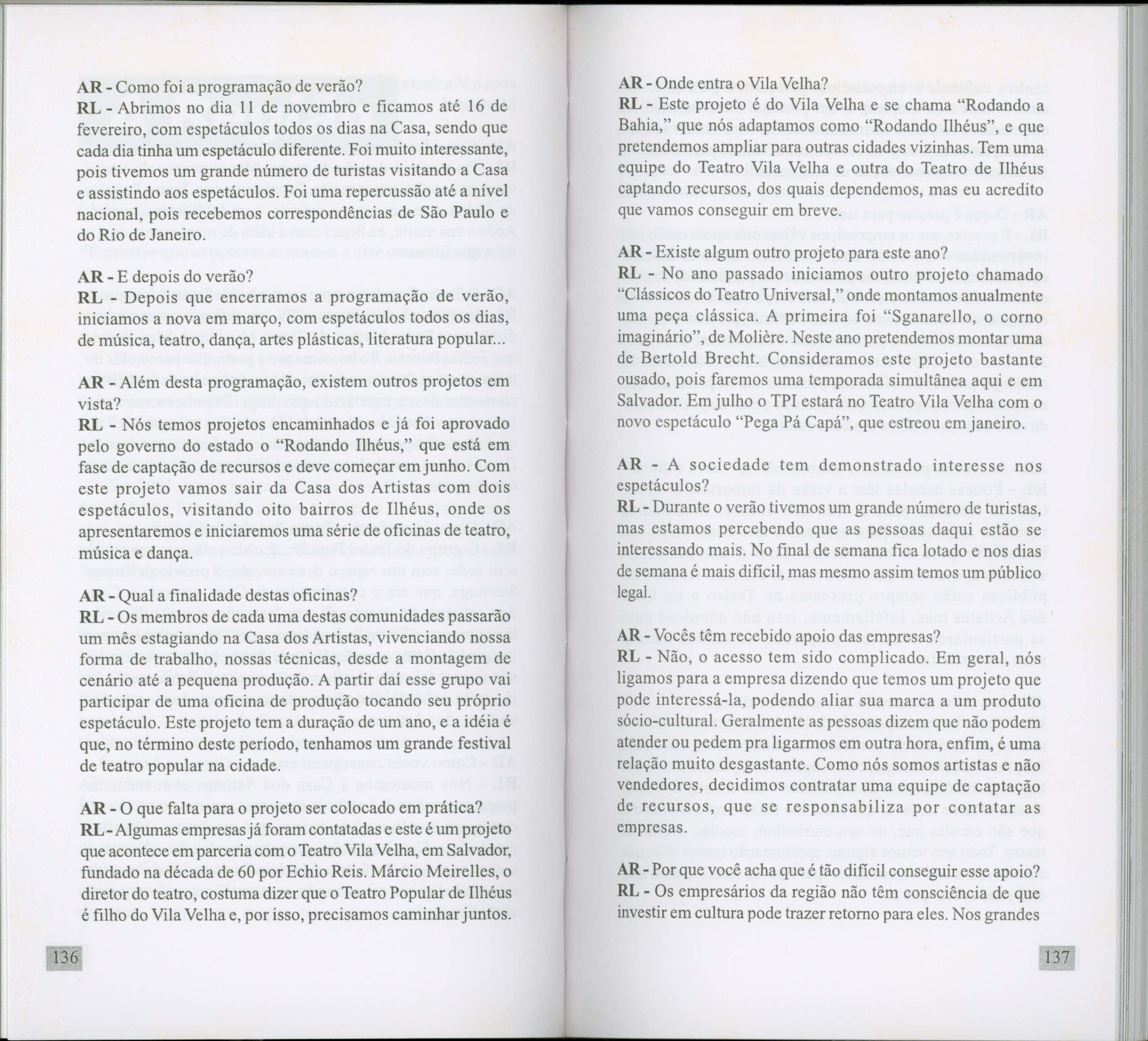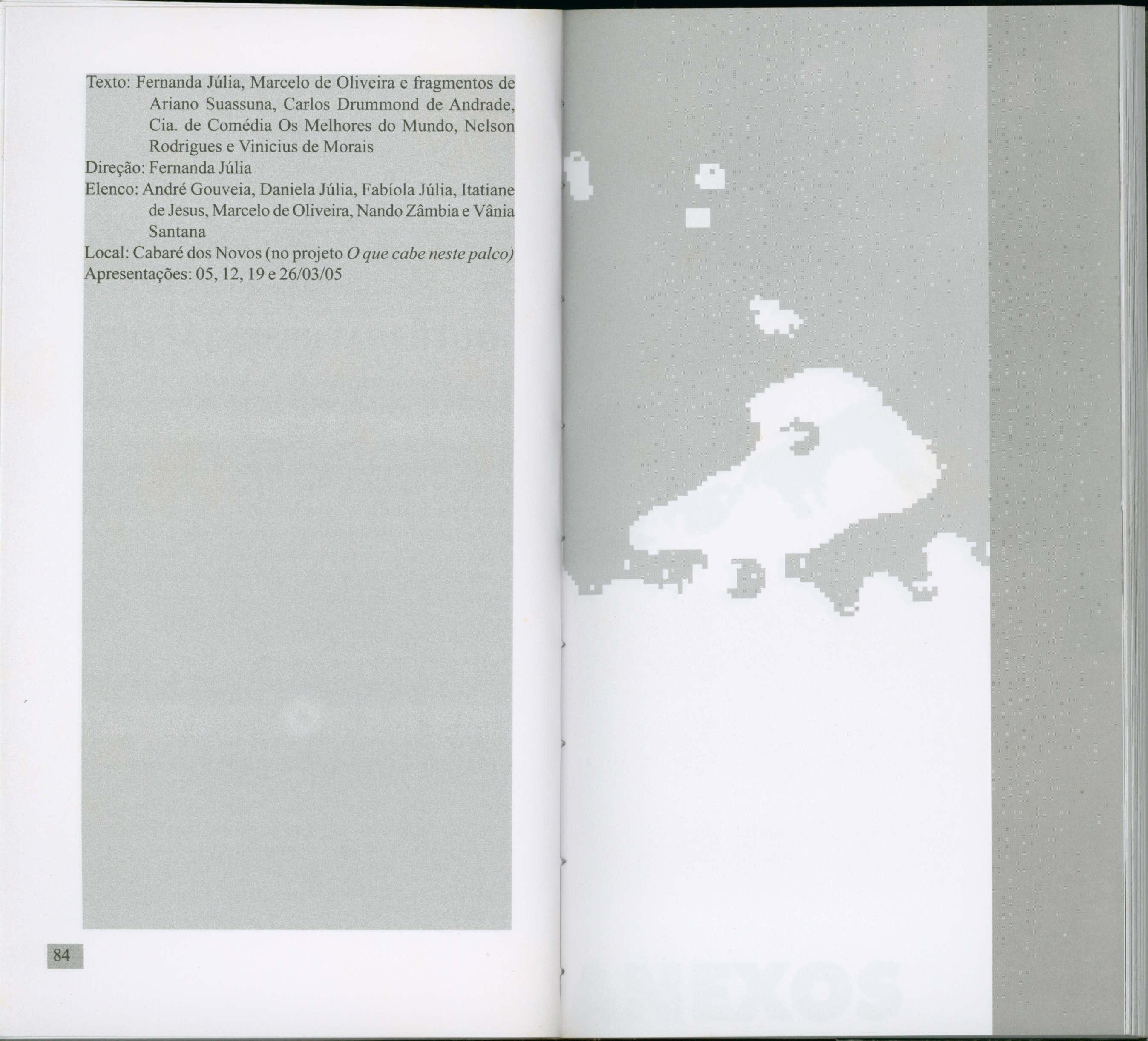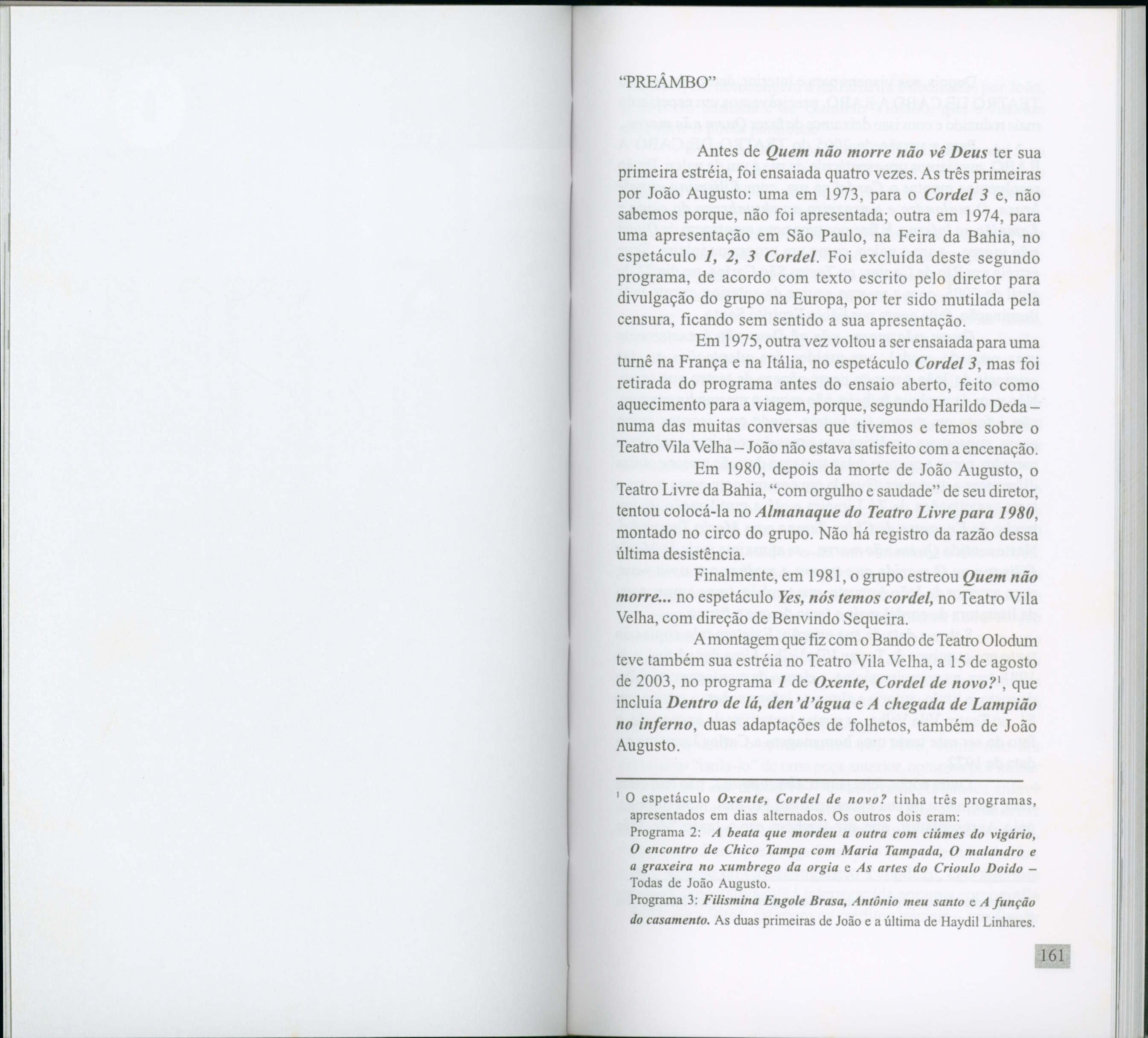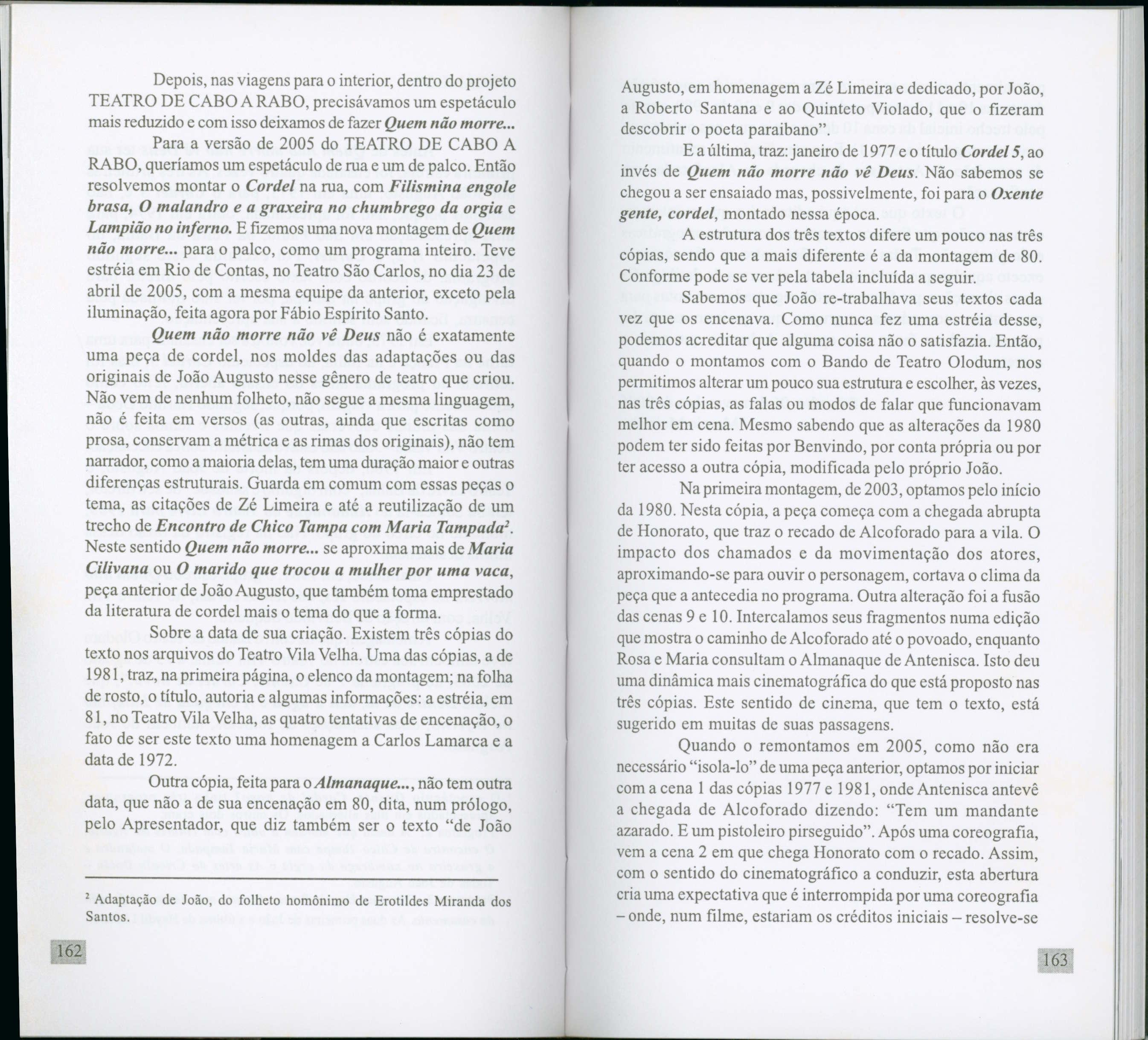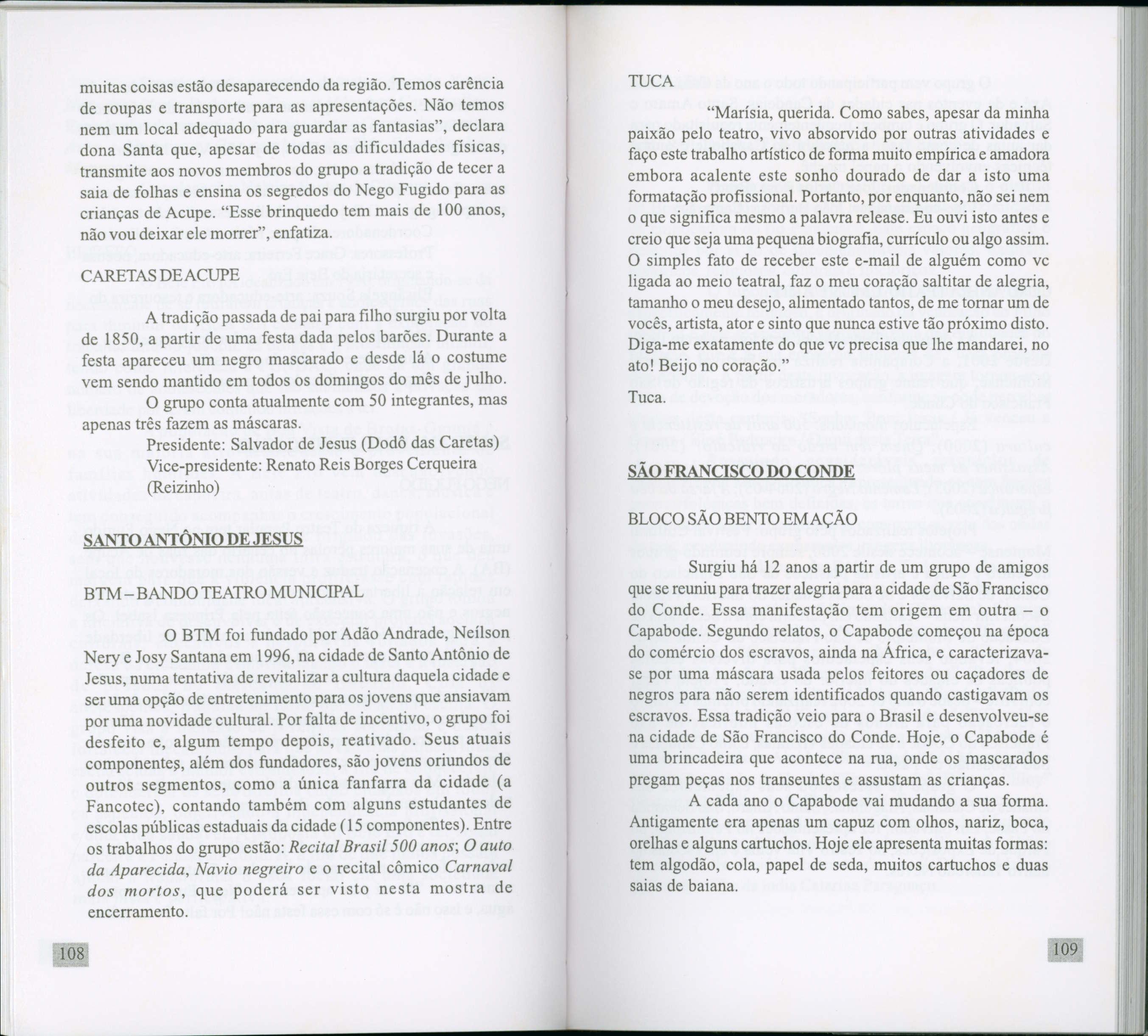 Esse livro reúne anos de práticas, de espetáculos, de encontros que se deram em cidades de nomes sonoros e luminosos. Ano III [2004]: Madre de Deus, Valença, Alagoinhas, São Félix. Ano IV [2005]: Rio de Contas, Jacobina, Camaçari, Lauro de Freitas, Salvador e em tantos outros lugares onde o palco se ergue na praça, o figurino é costurado à mão, a iluminação vem do poste, e o público são os vizinhos, amigos, crianças, passantes.